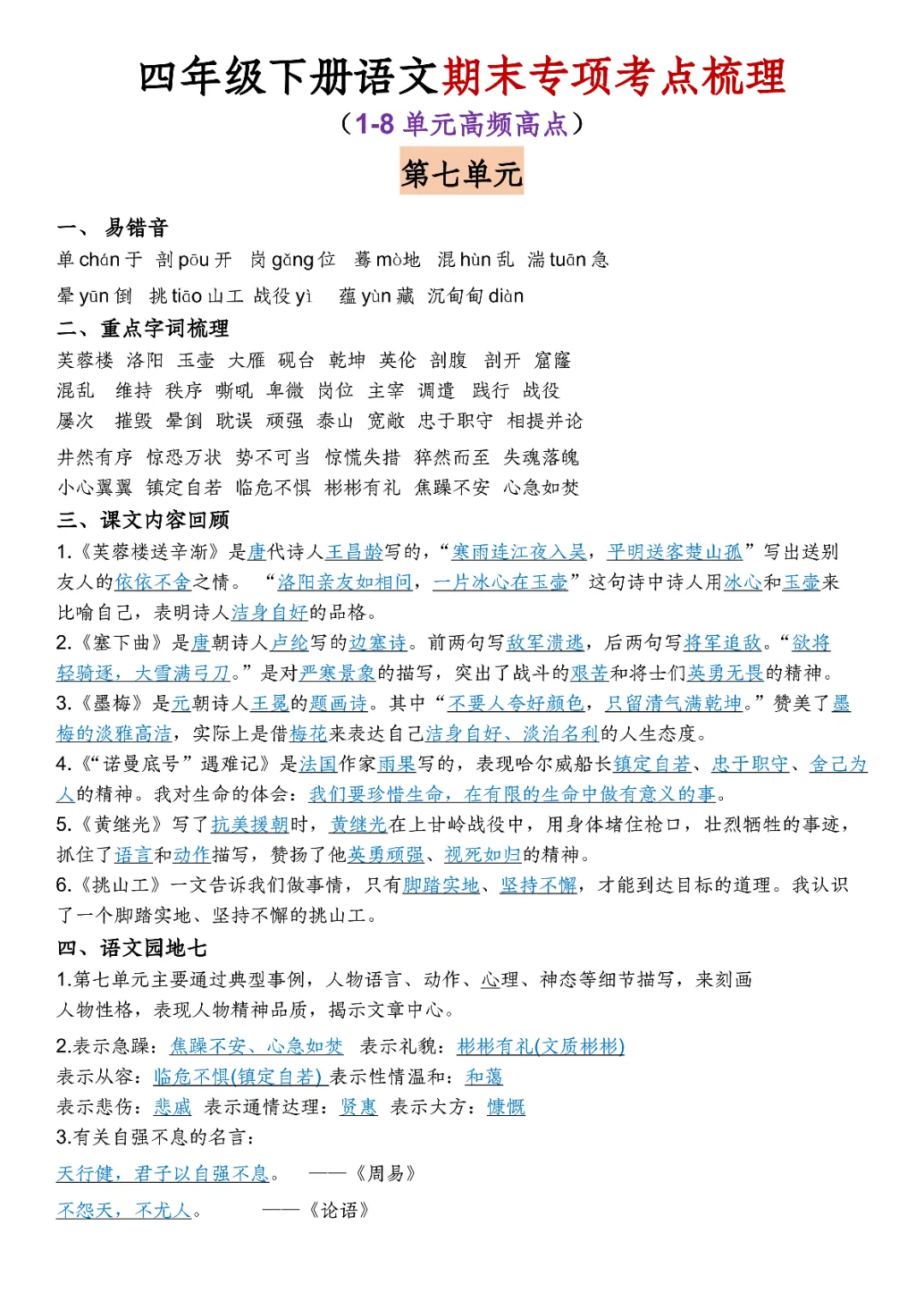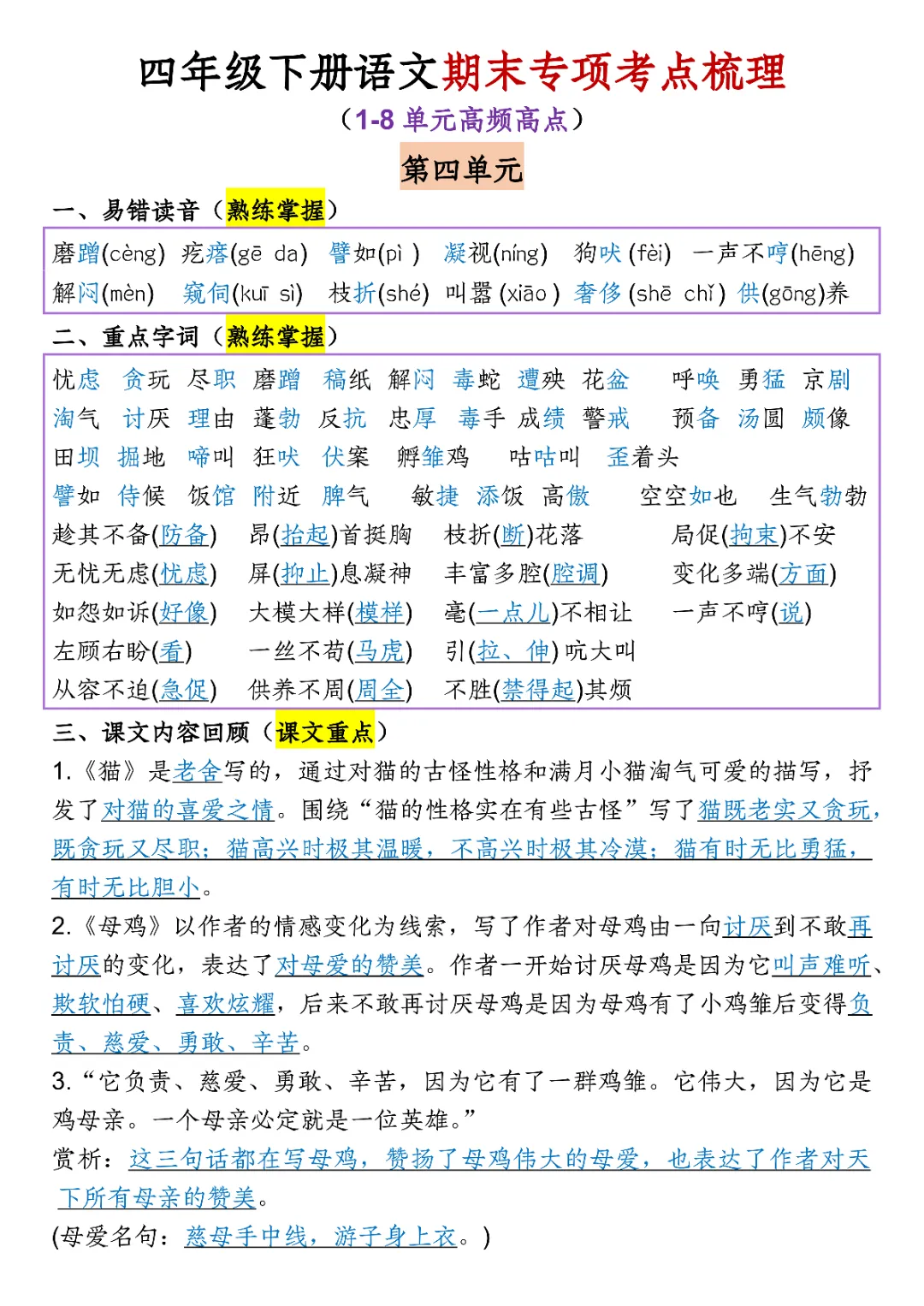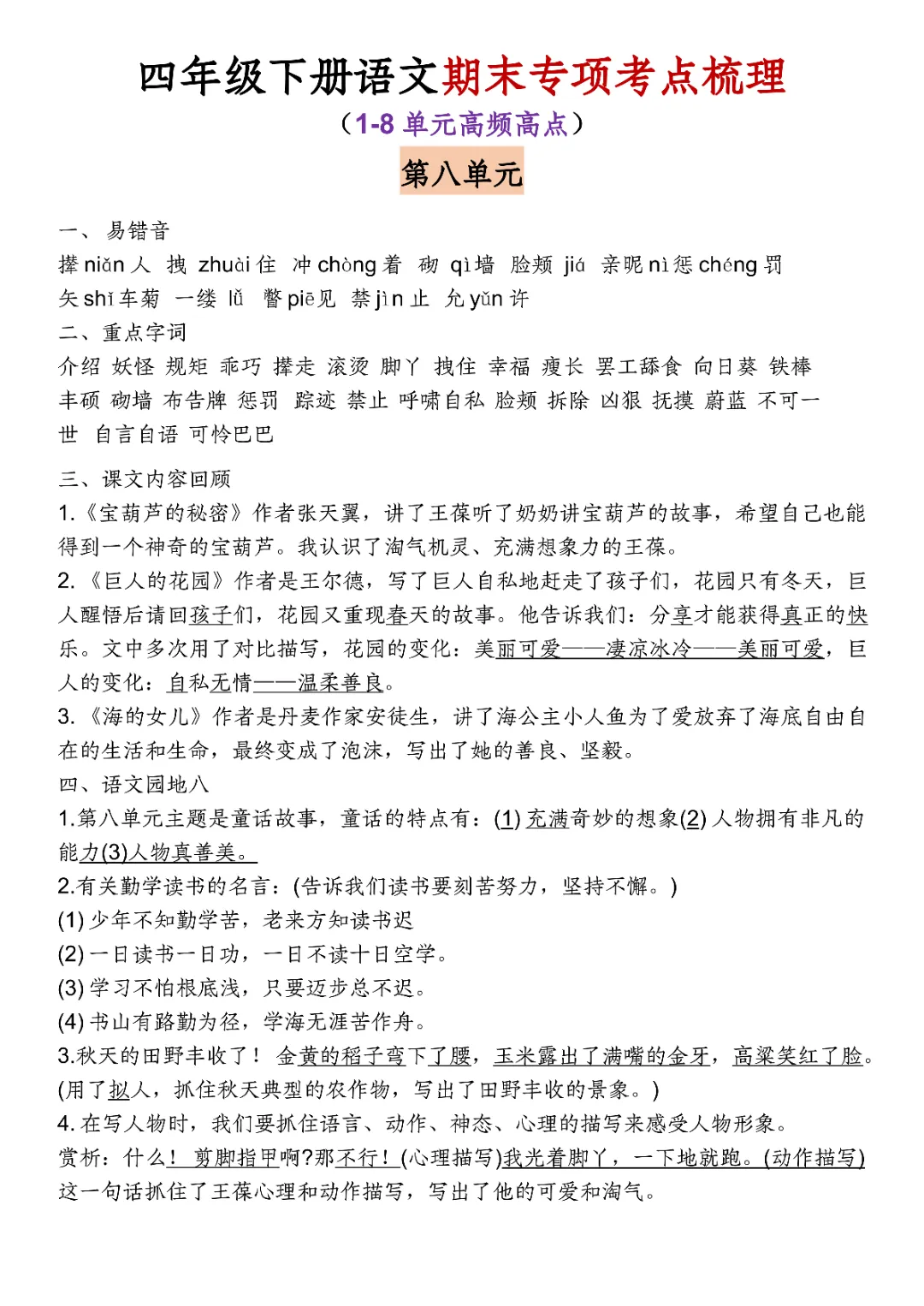 四年级下册语文1-8单元专项考点梳理(电子版可打印)