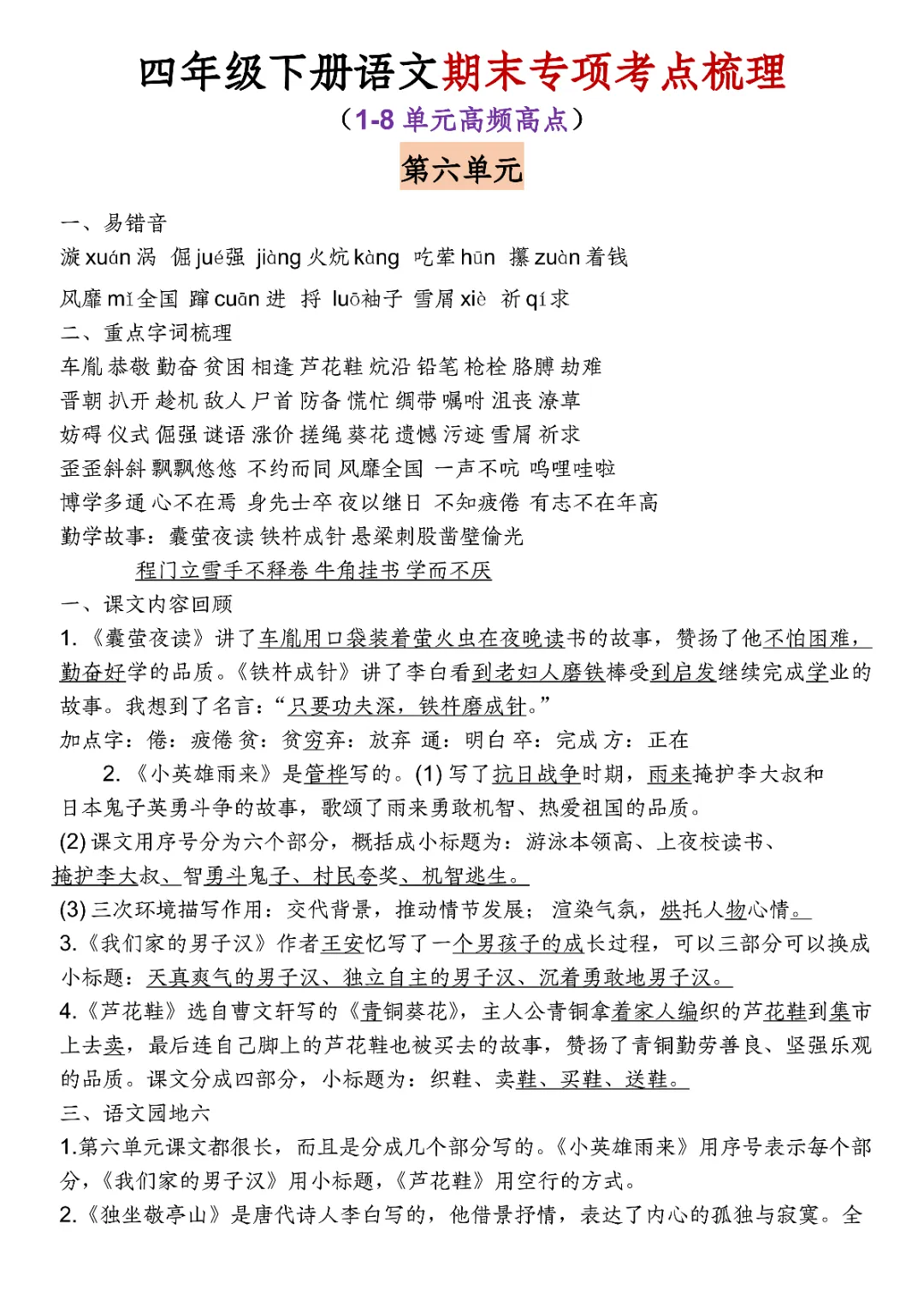 四年级下册语文1-8单元专项考点梳理|电子版可打印