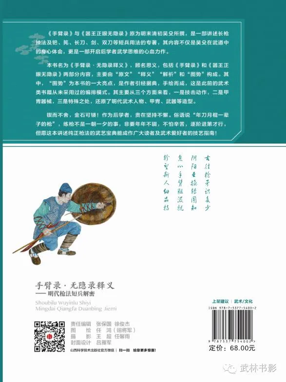 本书名为《手臂录·无隐录释义——明代枪法短兵解密》,顾名思义,包括《手臂录》和《器王正眼无隐录》两部分内容,主要由“原文”“释义”“解析”和“图势”构成。