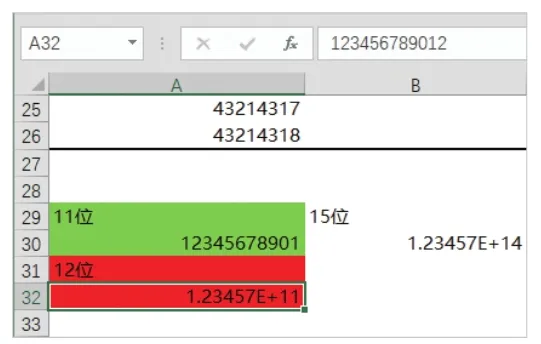 如果在A32单元格中输入12位数据“123456789012”,Excel则会以科学计数法显示。★