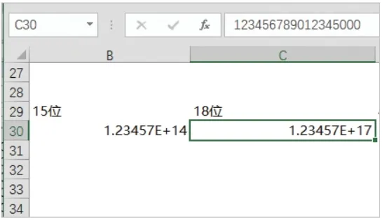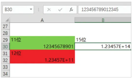 在单元格中,数据从第12位开始就以科学计数的形式展示,但在编辑栏中依然可以看到完整的数值。★