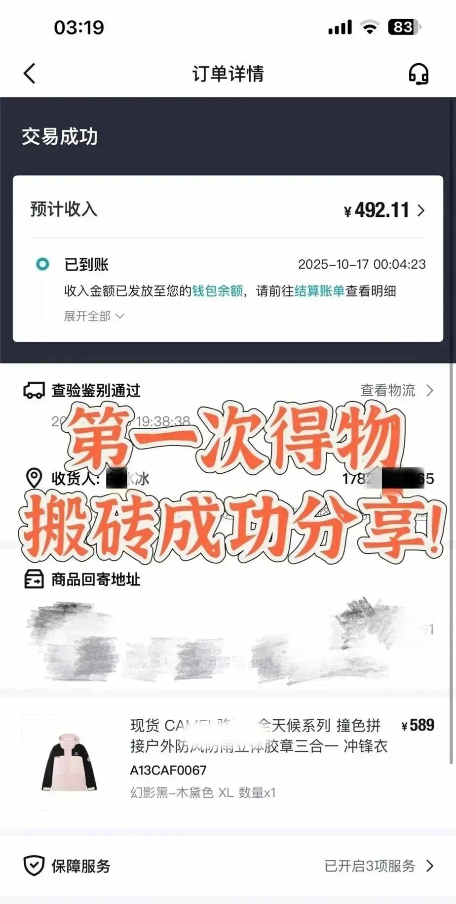 下单与发货:当有买家在你的得物店铺下单后,你立刻去低价货源平台下单,收货地址填写得物平台提供的鉴别中心地址。