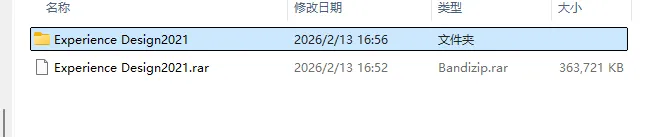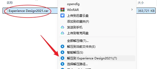 1.解压安装包:鼠标右击【Experience Design2021】压缩包,选择电脑上安装的解压软件,点击【解压到Experience Design2021】。