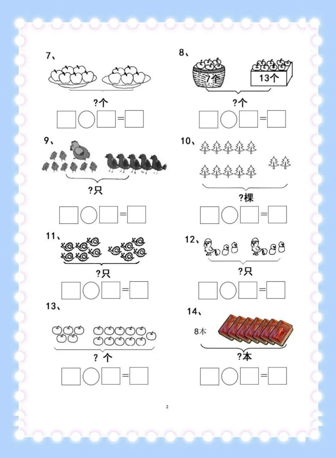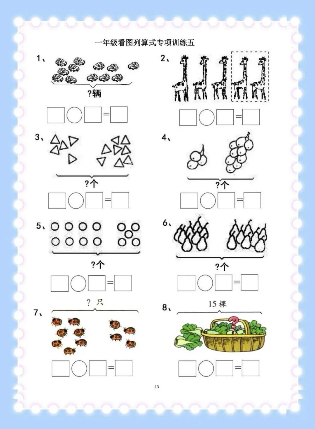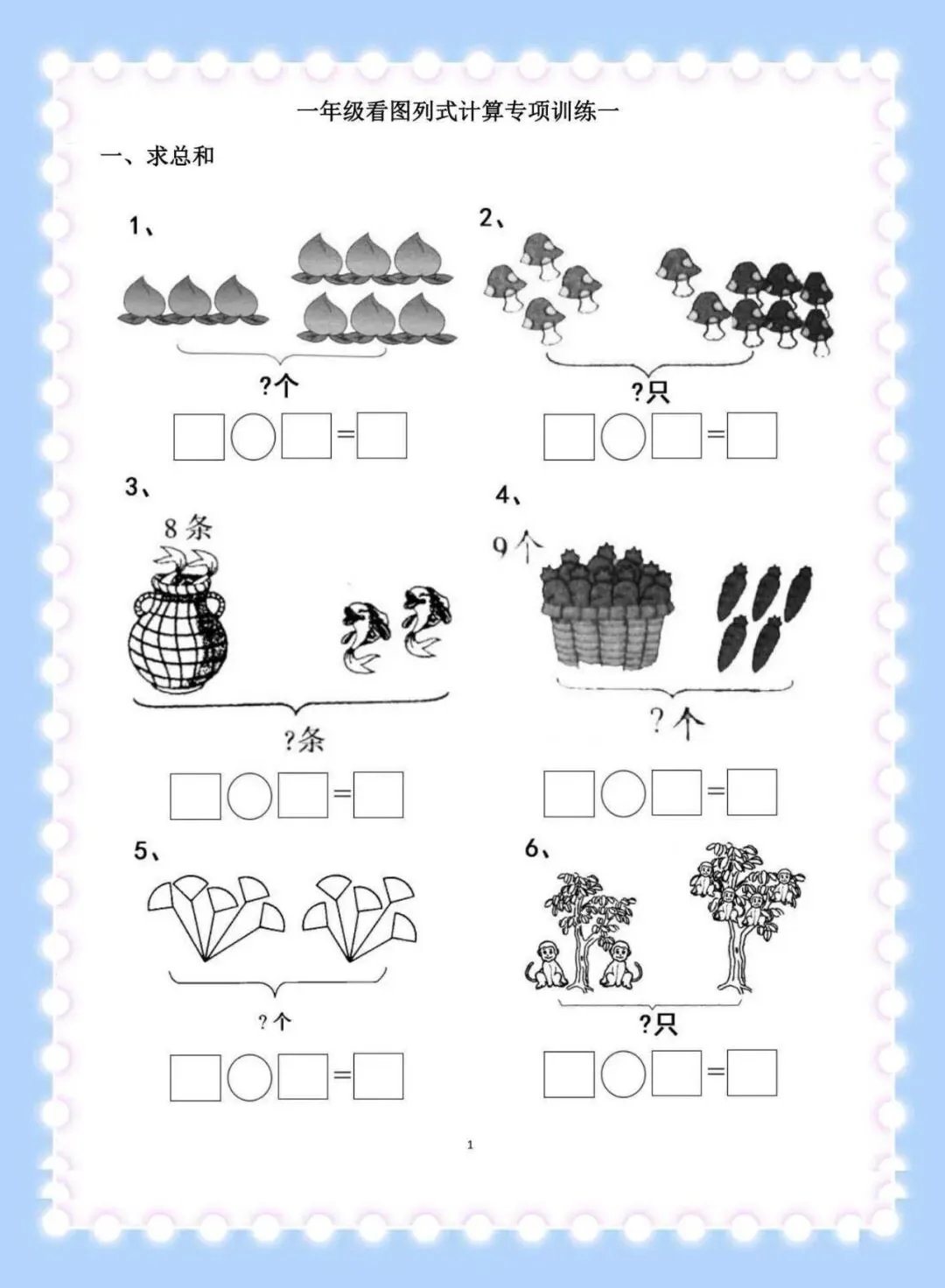 幼小衔接/一年级图列式专项训练,一共44页,涵盖求总和、求部分、连加连减、一图四式……每天一页,循序渐进,打印让孩子练一练吧!