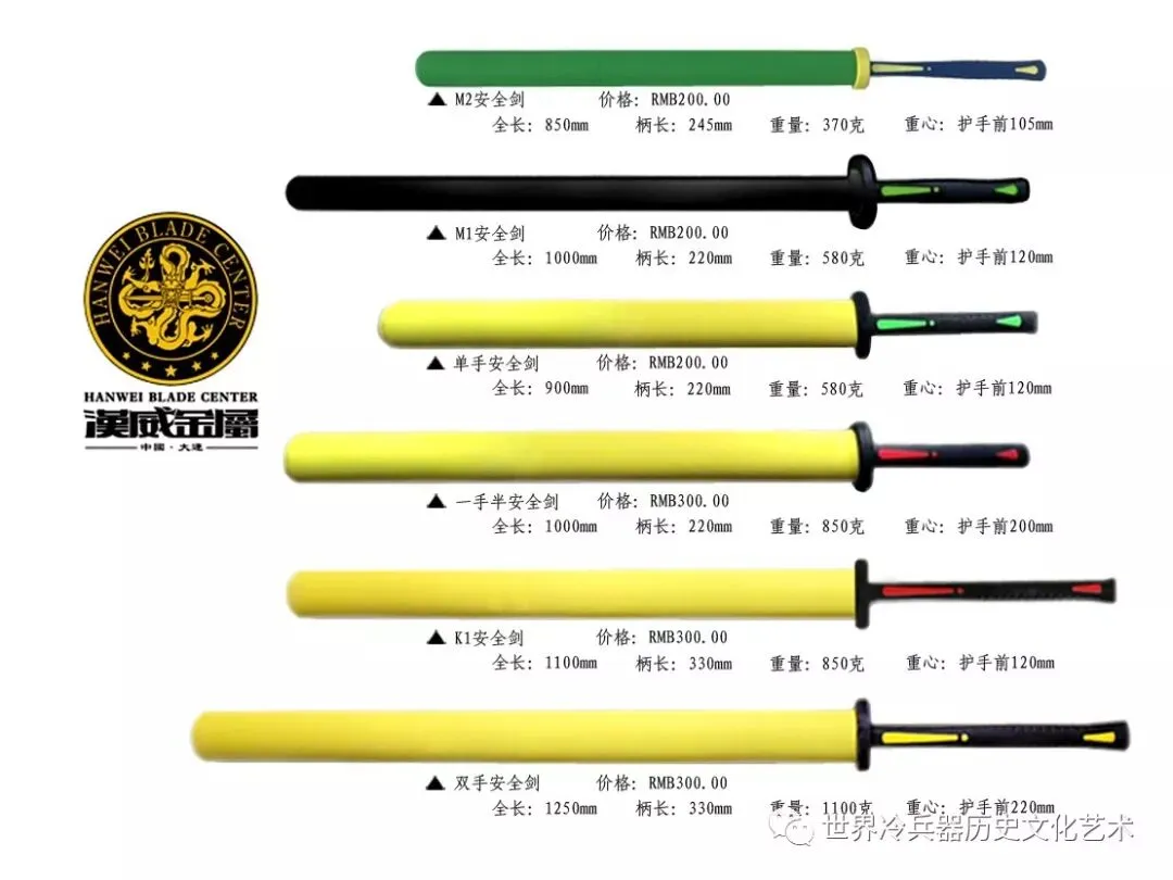 基于多年来对于各类金属刀剑设计制造的专业经验,结合同全球众多专业剑术团体的交流成果,汉威采用当代先进的材料学、结构力学、人体工程学等现代科技推出了全新体验式产品——安全剑些列产品,安全剑整体在重量、重心、结构、手感、各部分强度分配上全部都满足高仿真的剑术对抗运动的需要。汉威安全剑在重量和外形上设计考量了材料比重、强度和风阻等因素,经过测试检验,设计出在保证安全性的前题下同时能够带给爱好者最大乐趣的对抗练习剑。基于精心设计的外形和各项性能指标使得手柄和后半部分剑刃的手感和强度接近真剑,在快速挥舞和对抗接触中有效支持劈砍、刺击、格挡、缠剑、滑剑从而实现劲力的发挥,同时剑刃的前端在对抗中会产生合理强度和范围的形变,并且瞬间回弹,加之整剑表面材料弹性合理,汉威安全支持剑术招式的发挥和攻防的转换最大程度的在保证安全的前提下还原了对抗的真实性。手柄内部采用挤拉工艺制成玻璃纤维芯棒,表面为弹性抗冲击高分子材料注塑成型。手柄外形、强度、手感、摩擦力、减震等各项性能指标都可以满足高强度对抗需要,同时美观大方,结实耐用,环保无毒,符合出口标准。剑刃由三部分组成,内芯由玻璃纤维制成 内管由高品质材料制成EVA, 外层由高分子材料制成 这样的材料选择使剑刃在密度,强度,造型等经过多项测试和反复甄选,结实坚固韧性好,即使在极端严酷条件下破损也不会出现尖锐断面,有效的保证了对抗的仿真性和安全性。外层高分子材料制成安全无毒符合欧盟检测标准,经过多项实验最终选出的汉威安全剑外层剑刃套在结构和弹性系数上最符合安全对抗剑的需要,剑刃套分为长短两部分组成,长剑套紧密固定在剑刃上,短部分支持使用者自行更换,此项设计不仅延长了整剑使用寿命,更重要的是极大地提高了安全性。