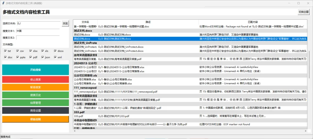 搜索完成后,结果会显示在右侧面板里,每个结果都会清楚地标明文件名、存储路径以及具体的匹配内容,让你一眼就能找到需要的信息。