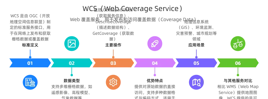 这几种服务均为 GIS 领域核心标准 / 规范,核心区别在于数据形态、交互方式、应用场景:WMS/WMTS/WMSC/TMS 专注地图可视化,WFS 管矢量要素读写,WCS 负责栅格数据存取,WPS 聚焦空间分析计算。以下是详细对比与说明: