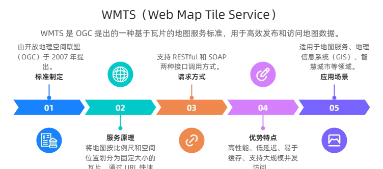 核心能力:预生成金字塔瓦片(固定层级、行列、范围),客户端按行列 / 层级请求静态瓦片,支持 GetTile、GetCapabilities。 -