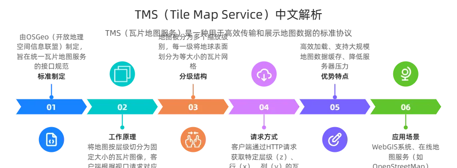核心:开源瓦片规范,与 WMTS 类似但Y 轴方向相反(TMS 从下到上,WMTS 从上到下),支持 GetTile、GetCapabilities。 -