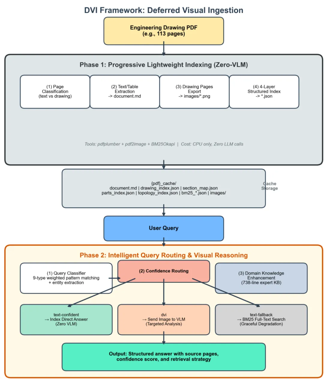 Original Abstract: Existing multimodal document question answering methods universally adopt a supply-side ingestion strategy: running a Vision-Language Model (VLM) on every page during indexing to generate comprehensive descriptions, then answering questions through text retrieval. However, this “pre-ingestion” approach is costly (a 113-page engineering drawing package requires approximately 80,000 VLM tokens), end-to-end unreliable (VLM outputs may fail to be correctly retrieved due to format mismatches in the retrieval infrastructure), and irrecoverable once it fails. This paper proposes the Deferred Visual Ingestion (DVI) framework, adopting a demand-side ingestion strategy: the indexing phase performs only lightweight metadata extraction, deferring visual understanding to the moment users pose specific questions. DVI’s core principle is “Index for locating, not understanding”–achieving page localization through structured metadata indexes and BM25 full-text search, then sending original images along with specific questions to a VLM for targeted analysis. Experiments on two real industrial engineering drawings (113 pages + 7 pages) demonstrate that DVI achieves comparable overall accuracy at zero ingestion VLM cost (46.7% vs. 48.9%), an effectiveness rate of 50% on visually necessary queries (vs. 0% for pre-ingestion), and 100% page localization (98% search space compression). DVI also supports interactive refinement and progressive caching, transforming the “QA accuracy” problem into a “page localization” problem–once the correct drawing page is found, obtaining the answer becomes a matter of interaction rounds.