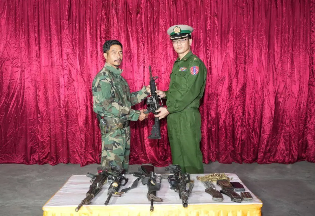 缅军宣传部门TV Myanmar于2月18日晚发布消息称,驻扎在实皆省耶乌镇的缅甸武装组织头目波纳加携带部分长短枪支向缅军缴械投降。
