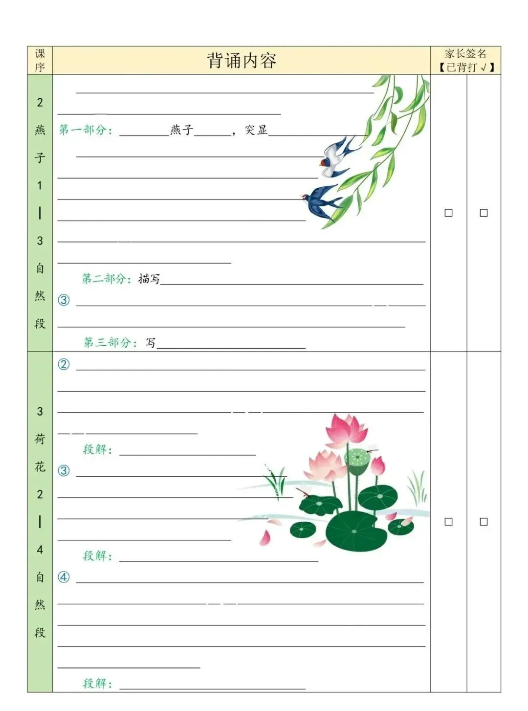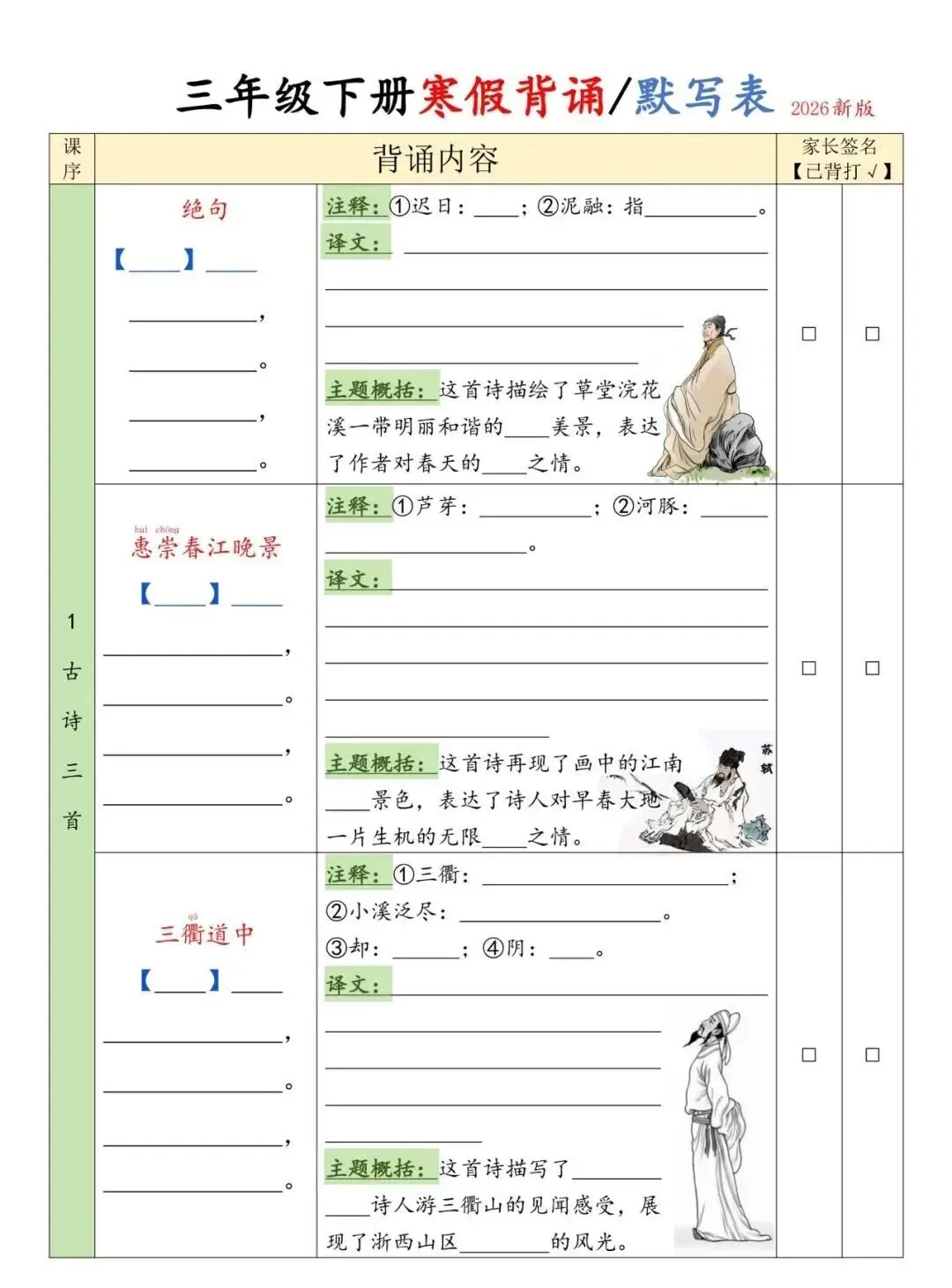 今天要分享的内容是三年级下册语文 寒假背诵默写表,从《绝句》《惠崇春江晚景》等经典古诗,到《守株待兔》文言文,再到《燕子》《荷花》的重点课文段落,还有日积月累的寓言成语、传统文化常识和高频易错字词,全部系统梳理。表中排版清晰,预留充足默写区域,告别零散的知识点整理,孩子能自主打卡背诵,家长无需费心规划。每天只需十几分钟,边背边写强化记忆,避免眼高手低,利用假期把基础打牢,让孩子下学期开学就能快速跟上课堂节奏,语文基础不丢分,学习更轻松。