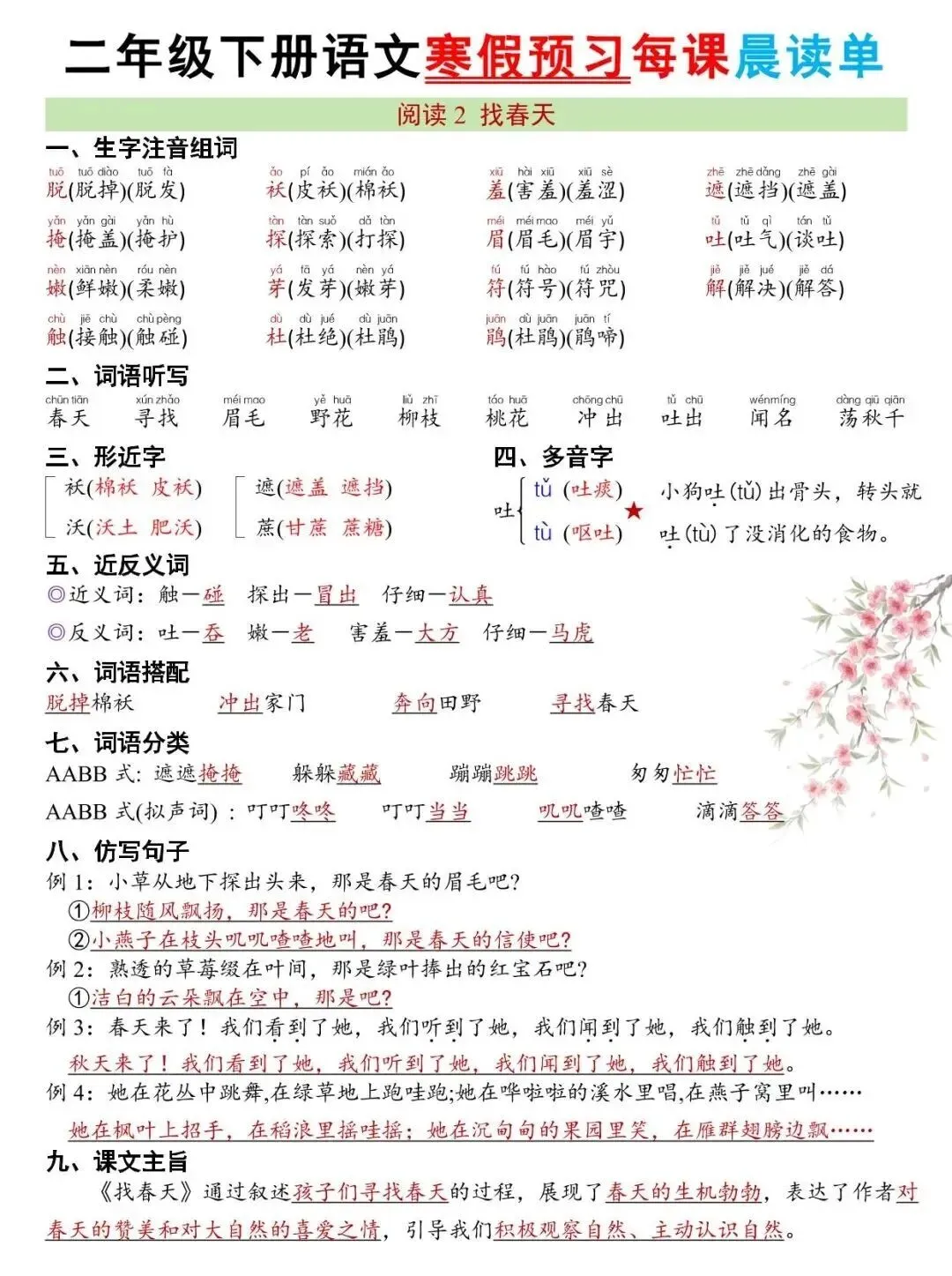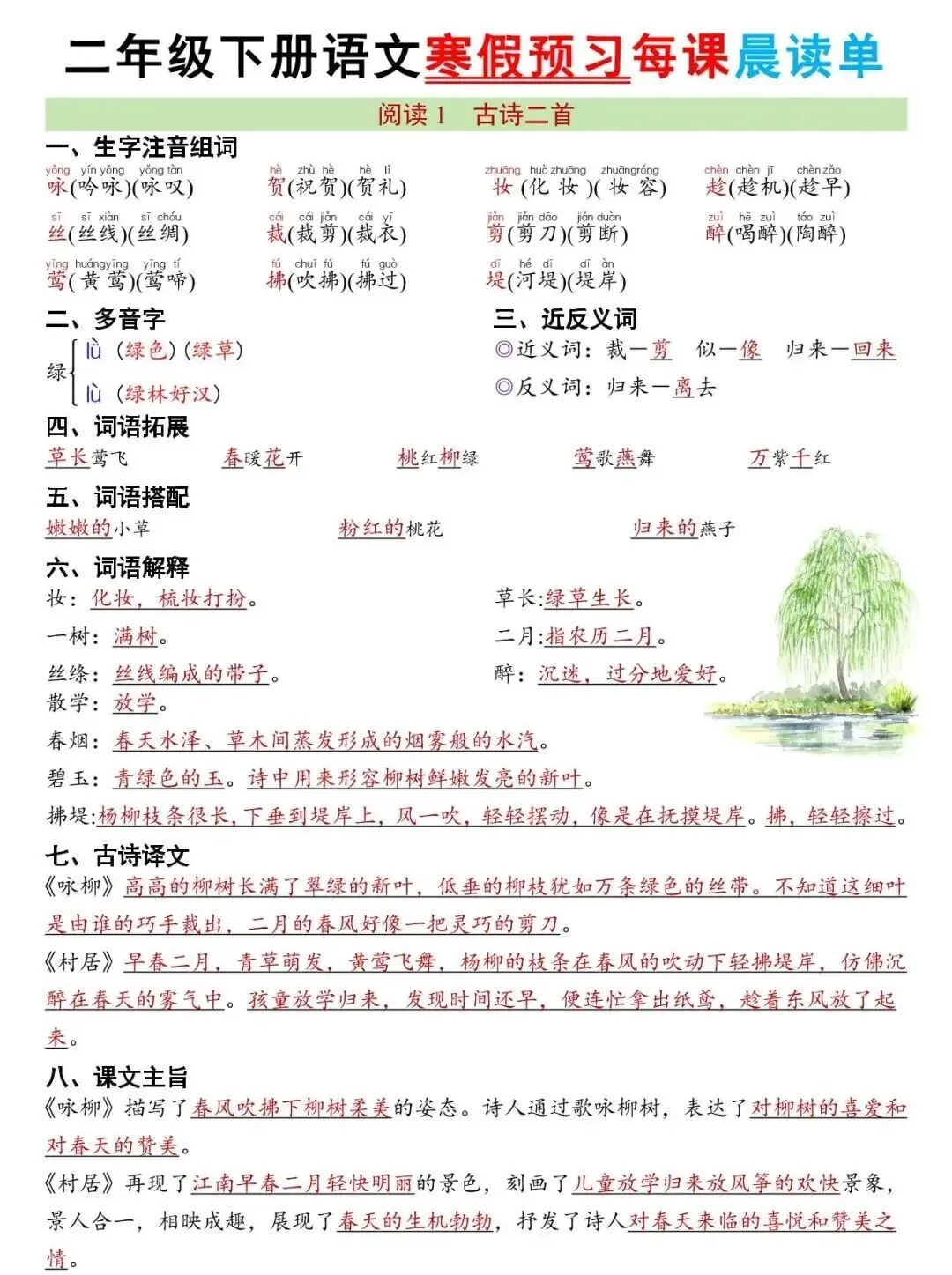 二年级下册语文 26版新寒假预习每课晨读单(电子版)