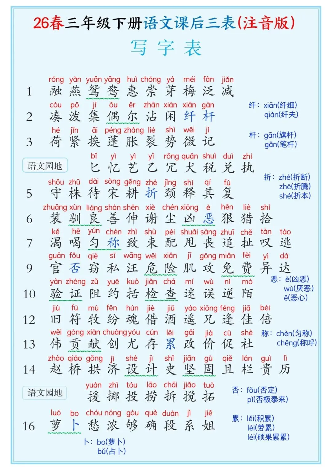 低年级实用!三年级下册三表注音26春 可打印8页电子版。