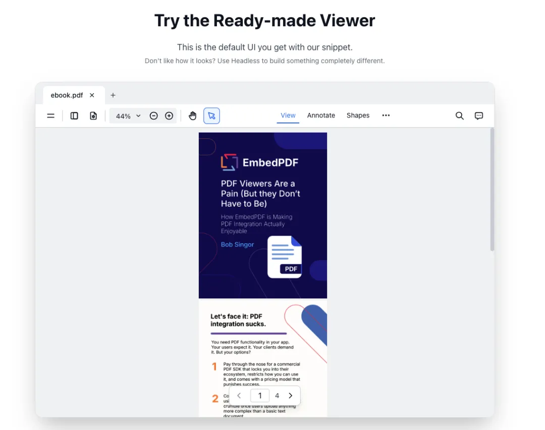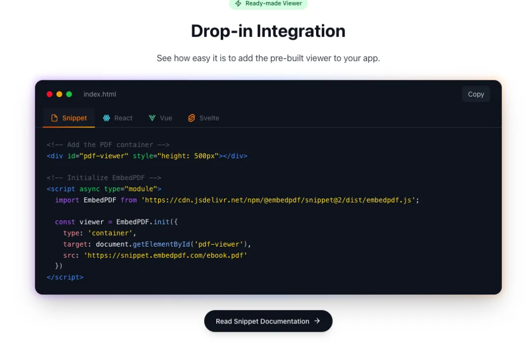 这个模式下,EmbedPDF 只负责核心渲染引擎,所有 UI 由你掌控。属于典型的“发动机给你,车壳自己造”。