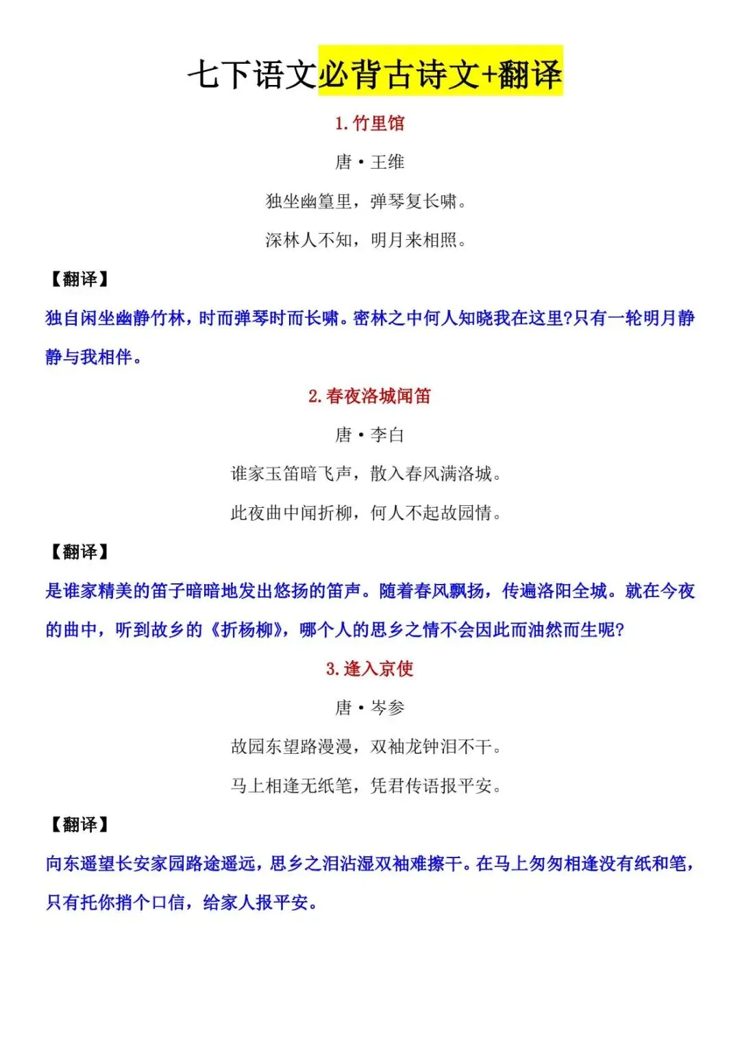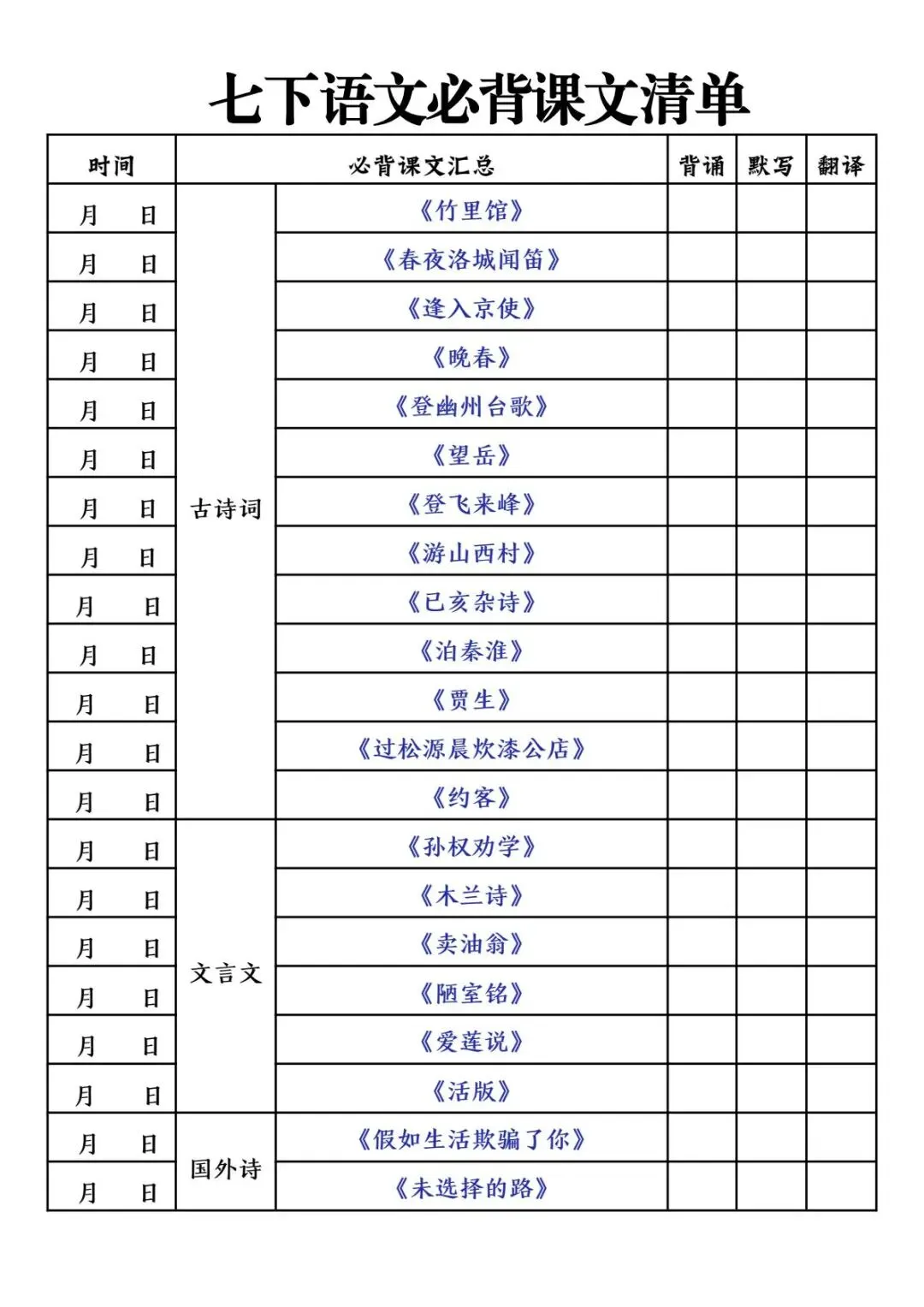 2026春人教部编版七年级下册语文寒假预习《课文必背内容汇总》(必背课文内容、古诗文、文言文),高清完整可打印