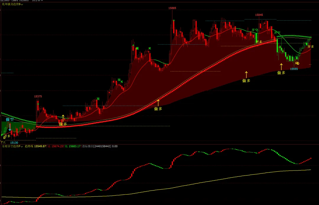 1、乾坤擒龙趋势9主图,东财多空趋势F幅图