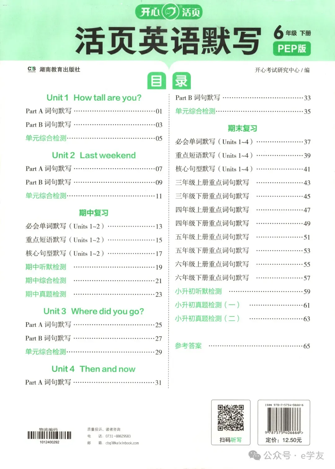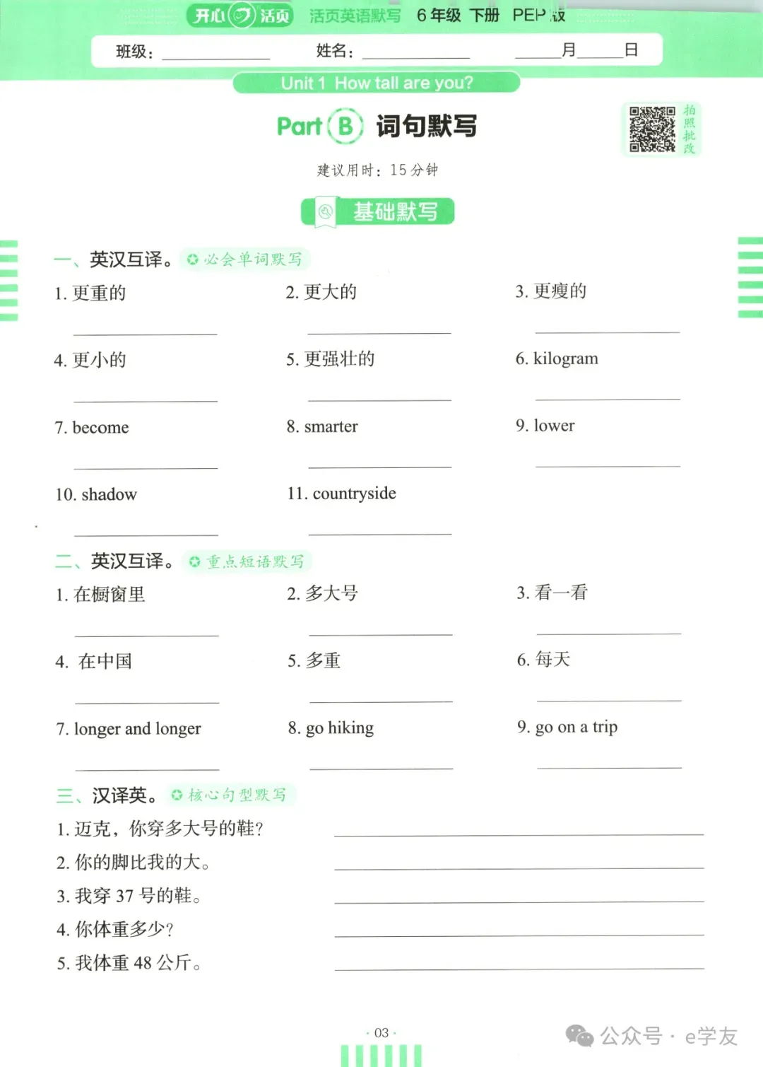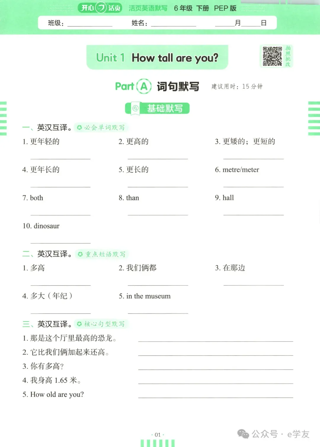 人教PEP版英语六年级下册《活页英语默写》电子版可打印