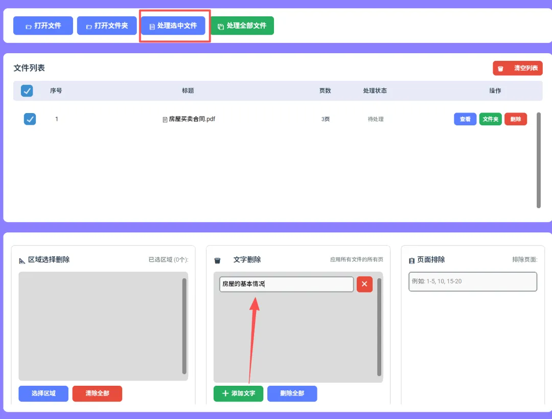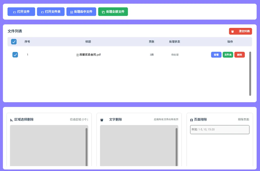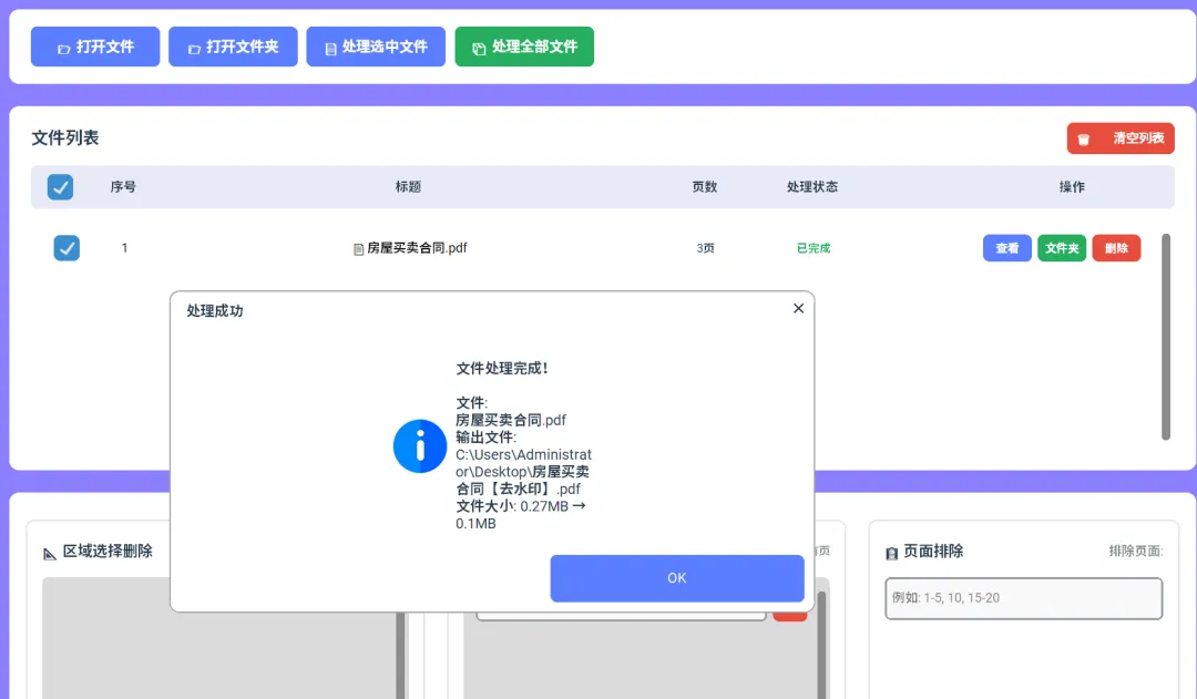 总之呢,这款工具最大特点支持两种删除方式,另一个就是可以批量处理,区域处理模式呢处理时可预览PDF页面,能精确选择需要删除的区域,文字删除模式呢,能自动搜索你输入的文字并删除所有匹配的文字,处理完了还会显示处理状态和结果。