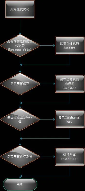 Solver中关键的就是调用Sovle函数和Step函数的流程,你只需要对照Solver类中两个函数的具体实现,看懂上面两个流程图就可以理解Caffe训练执行的过程了。