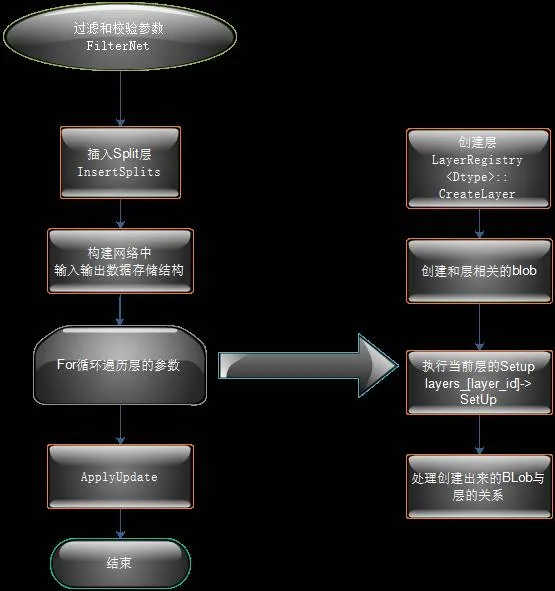分析过Solver之后我们来分析下Net类的一些关键操作。这个是我们使用Proto创建出来的深度网络对象,这个类负责了深度网络的前向和反向传递。以下是Net类的初始化方法NetInit函数调用流程: