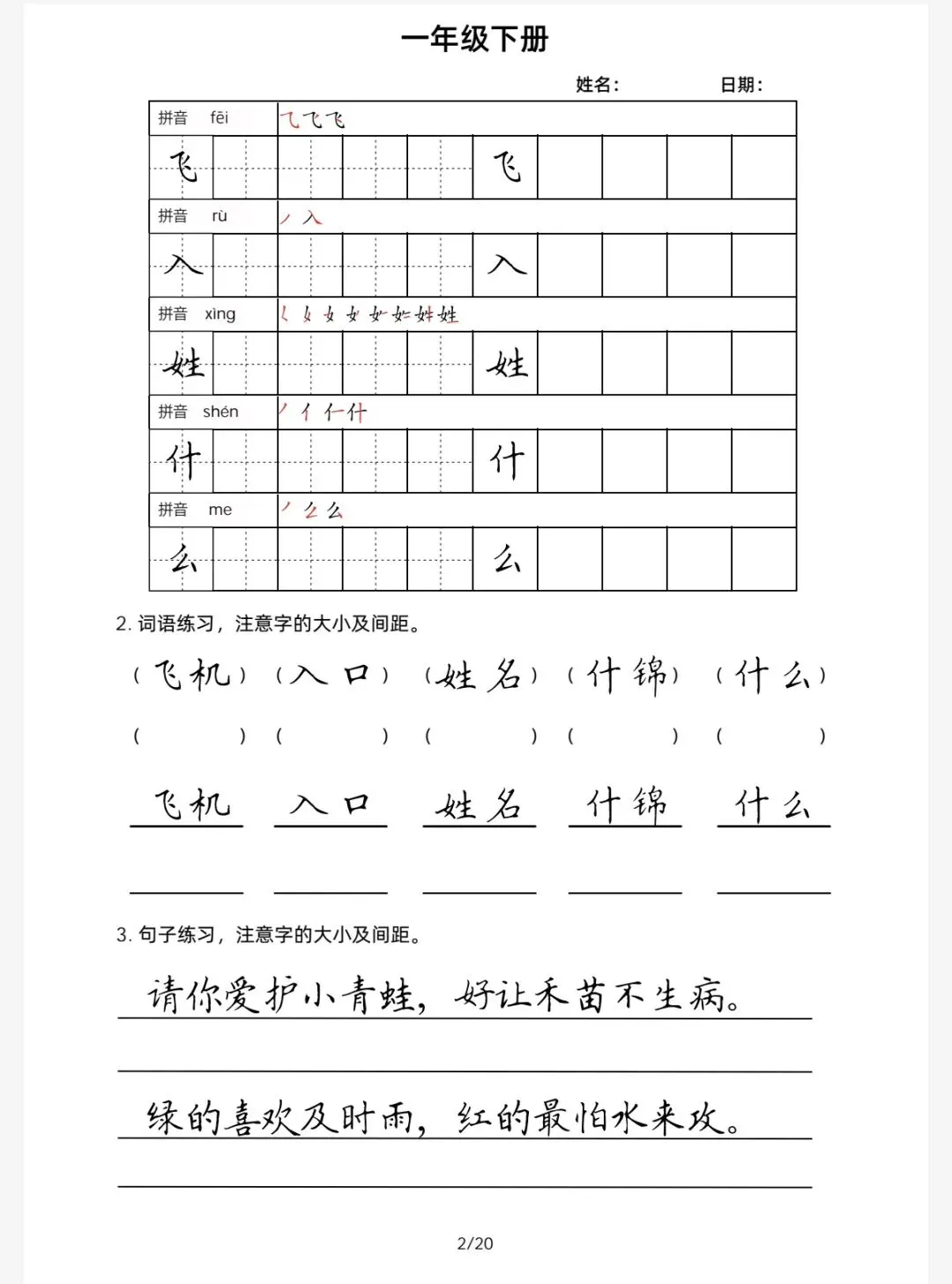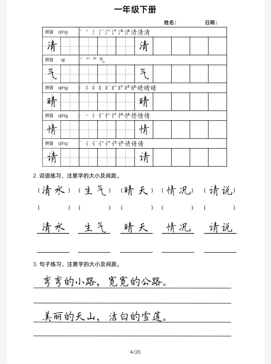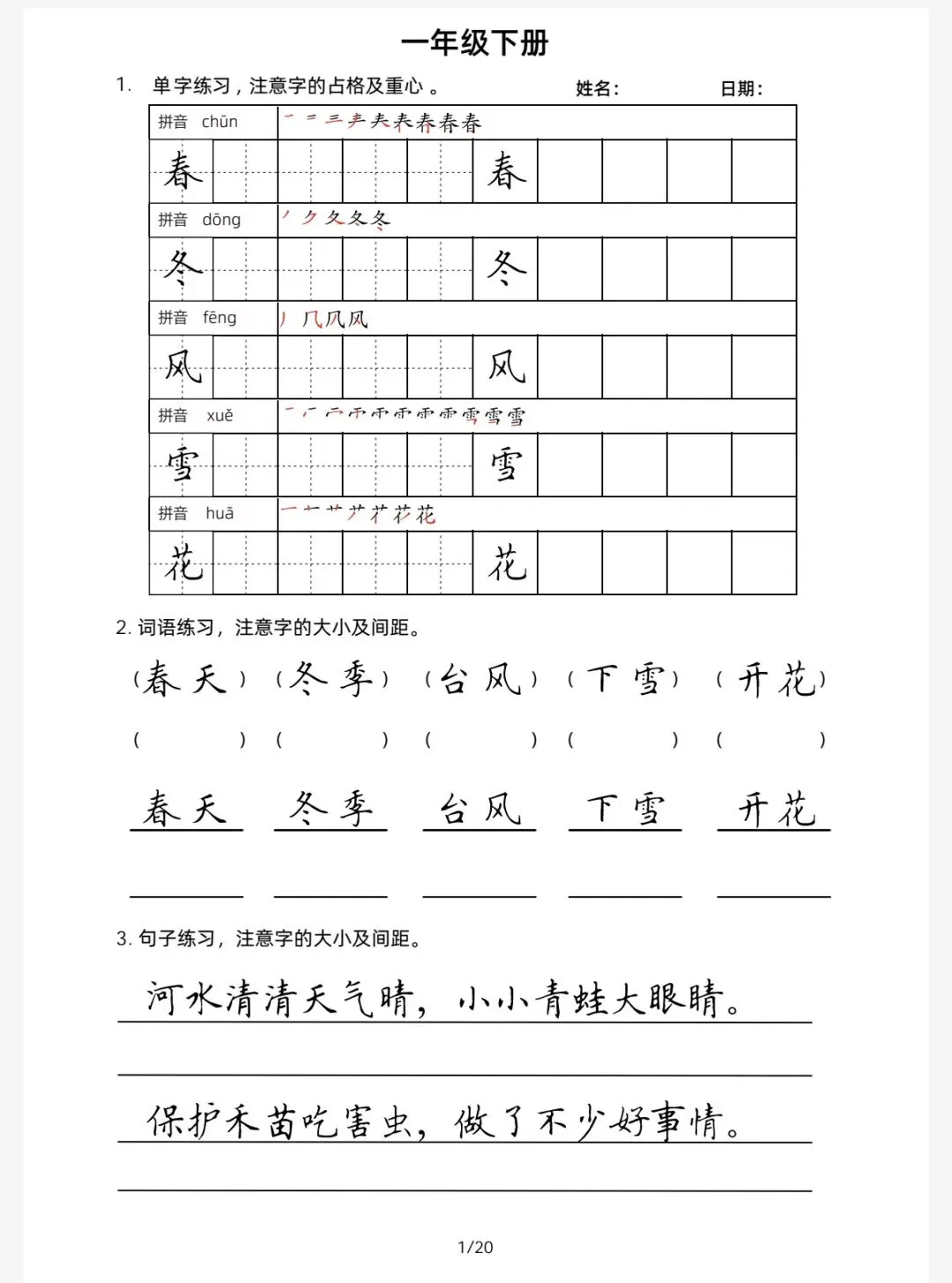 语文1年级下学期楷书字帖小练习(可免费保存下载)