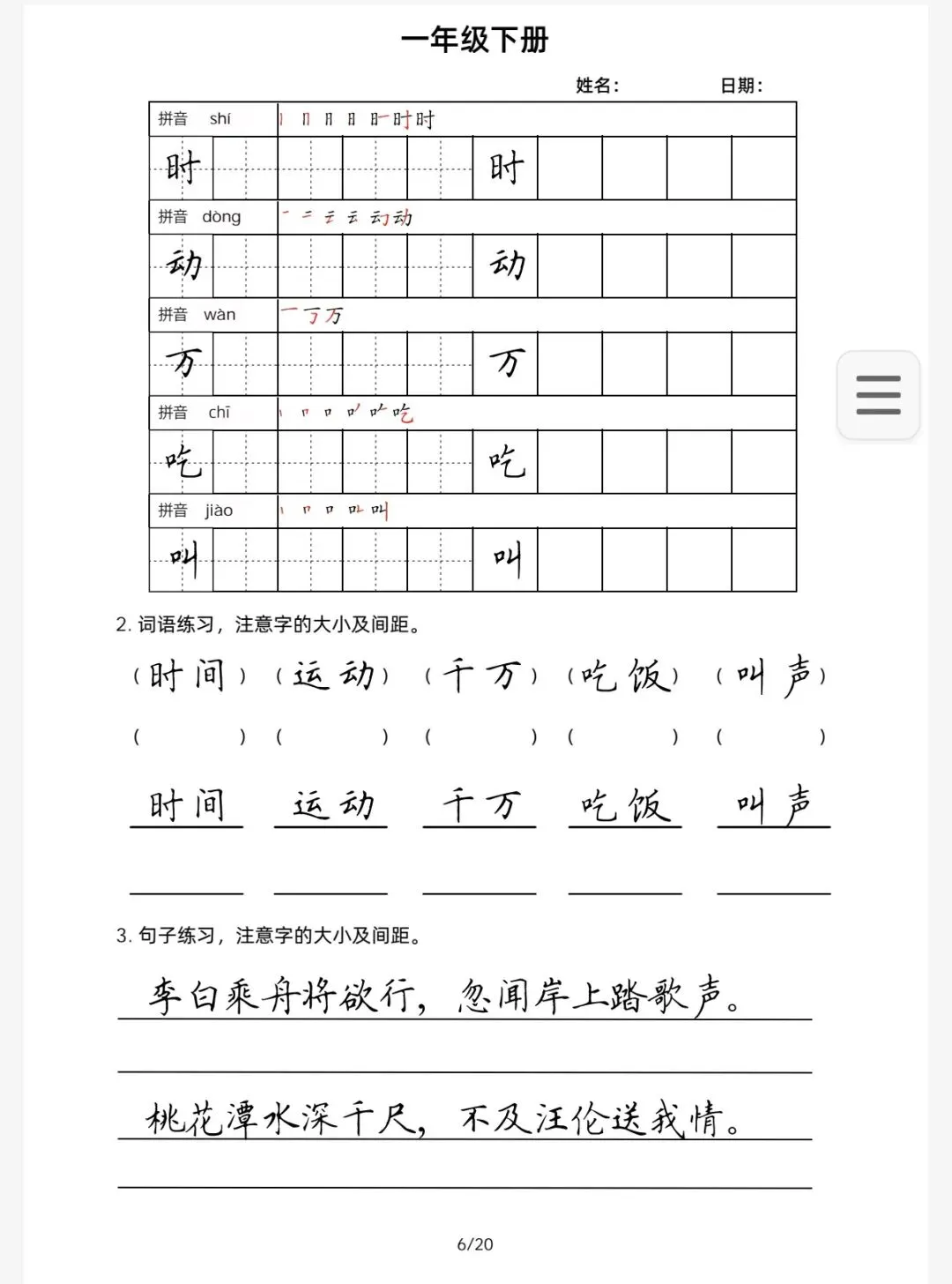 本文内容分享:【1年级字帖练习册】