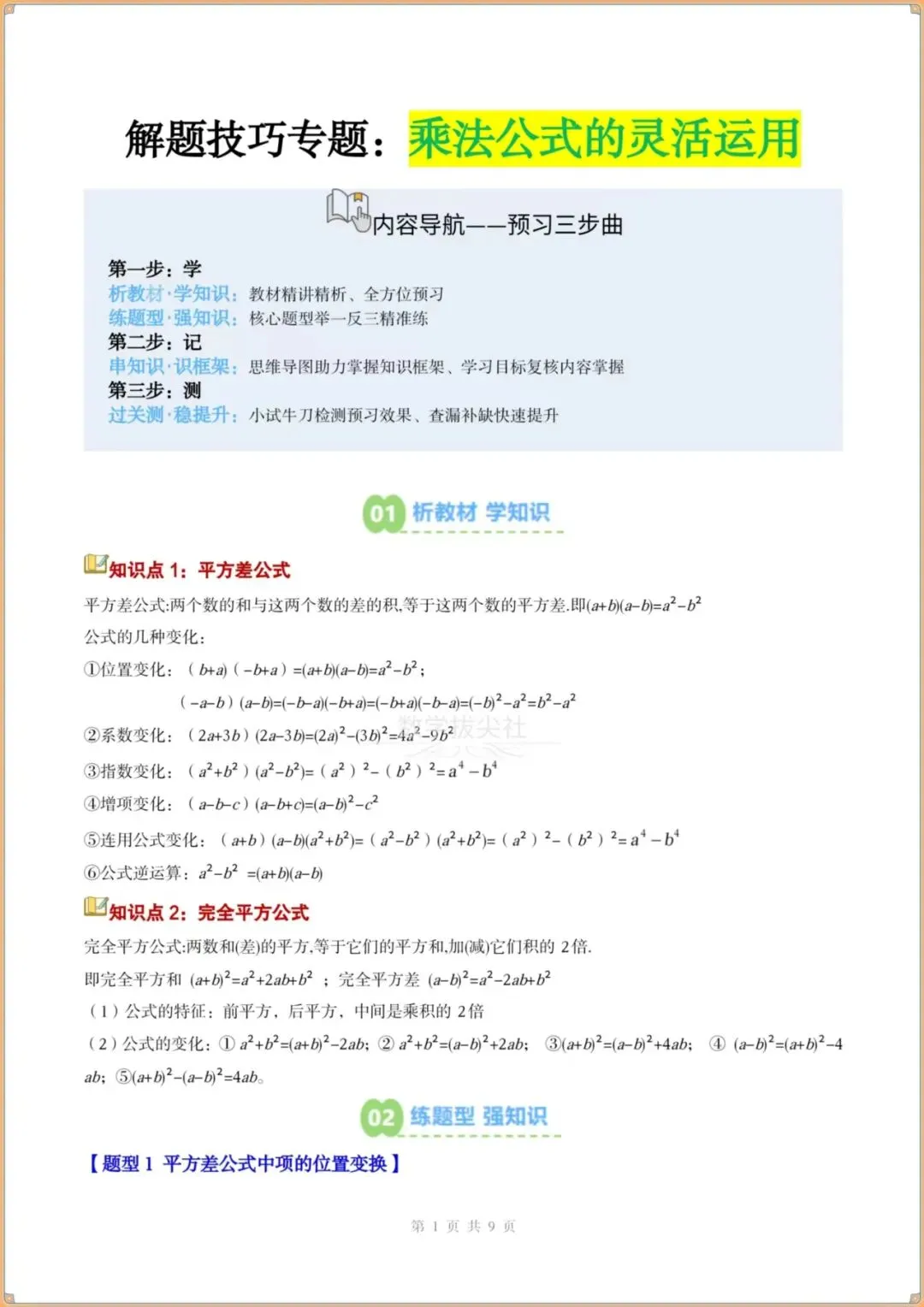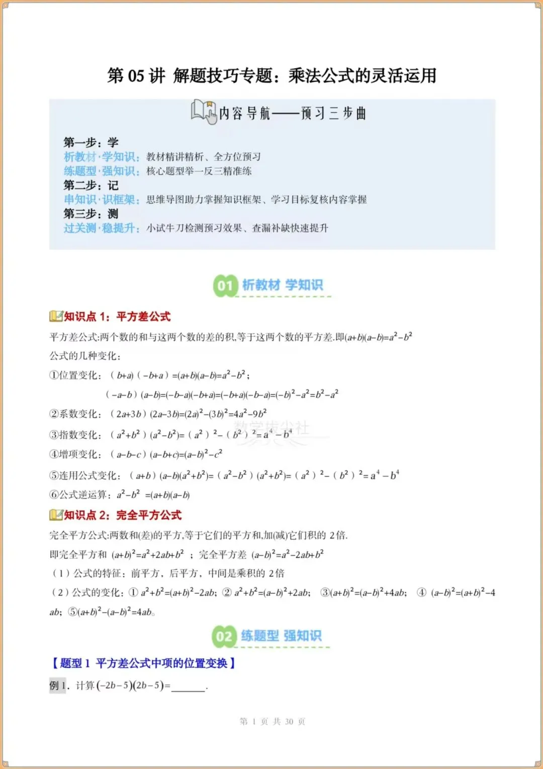 今日分享:👉2026春新版【北师版】七年级下册〈数学〉解题技巧《乘法公式的灵活运用》知识点梳理+专项练习,有解析。