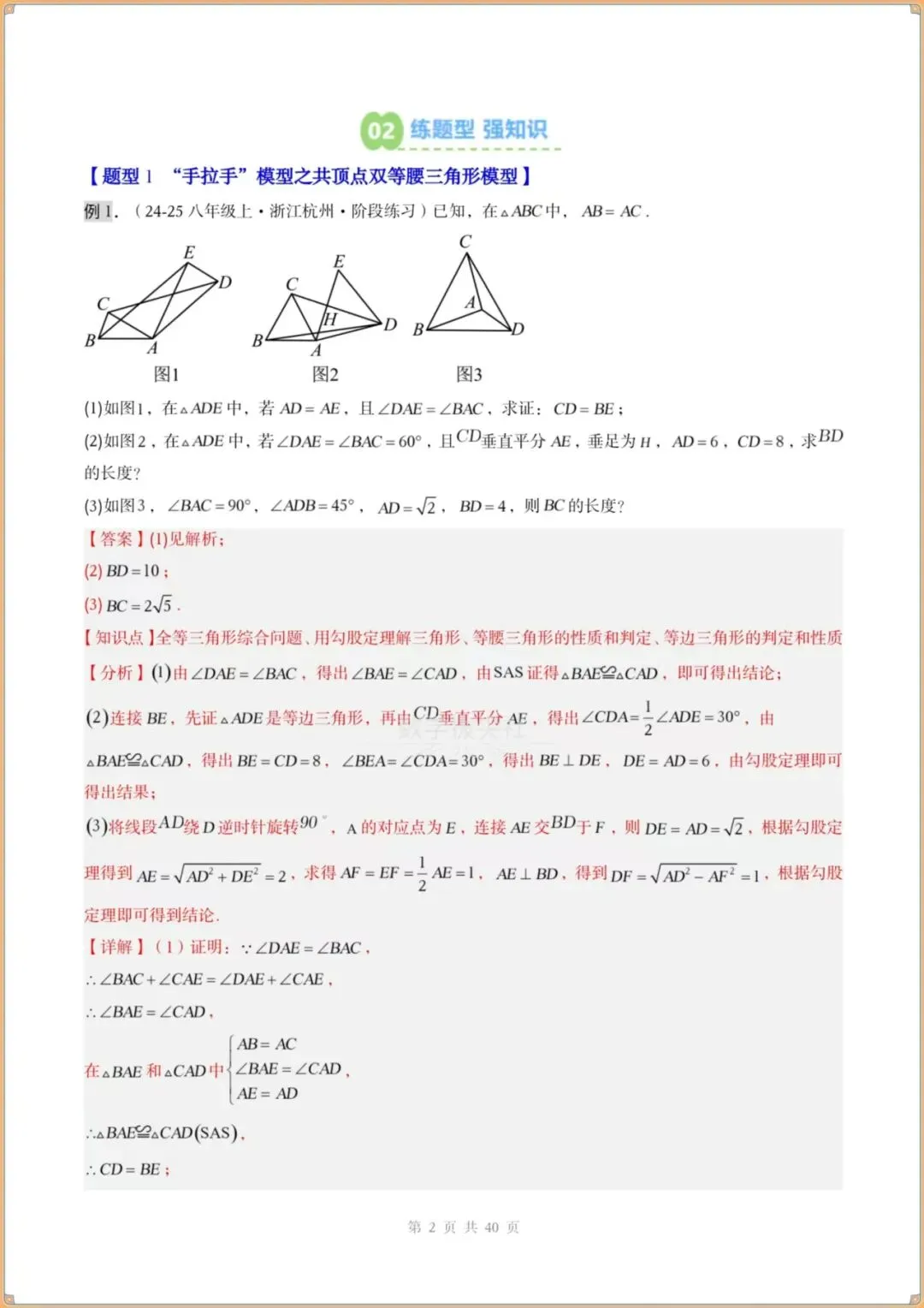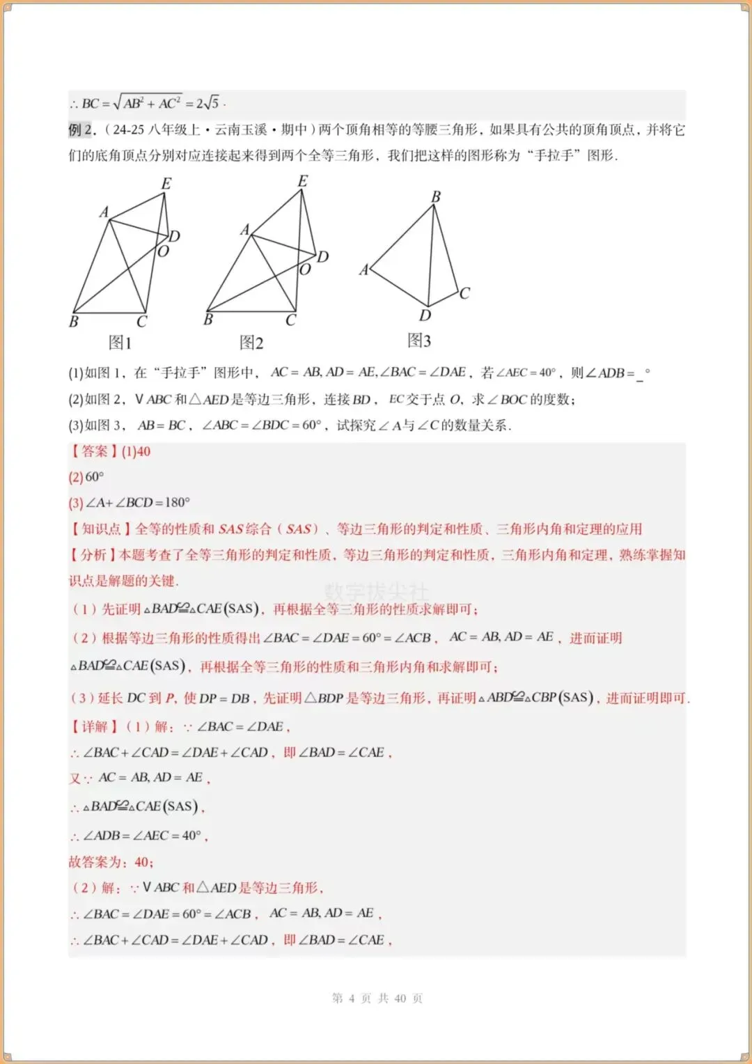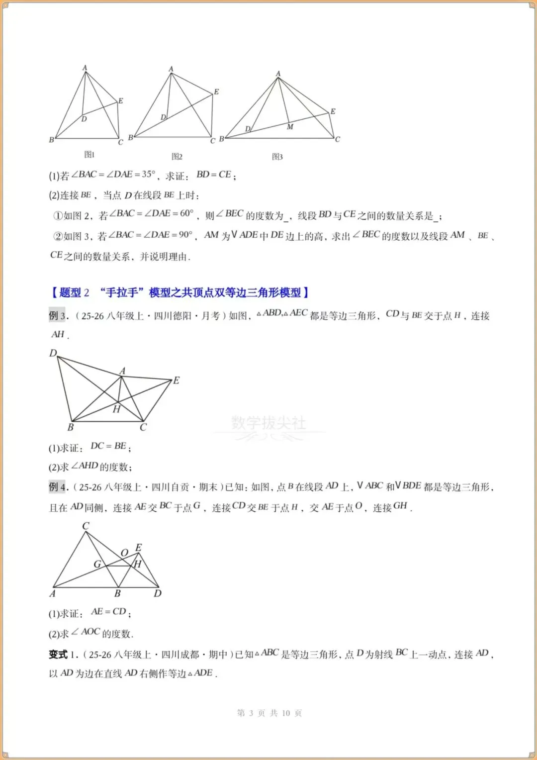 今日分享:👉2026春新版【北师版】八年级下册〈数学〉解题技巧《手拉手模型》共顶点的等腰三角形(3个知识点+3大题型)过关检测,有解析。