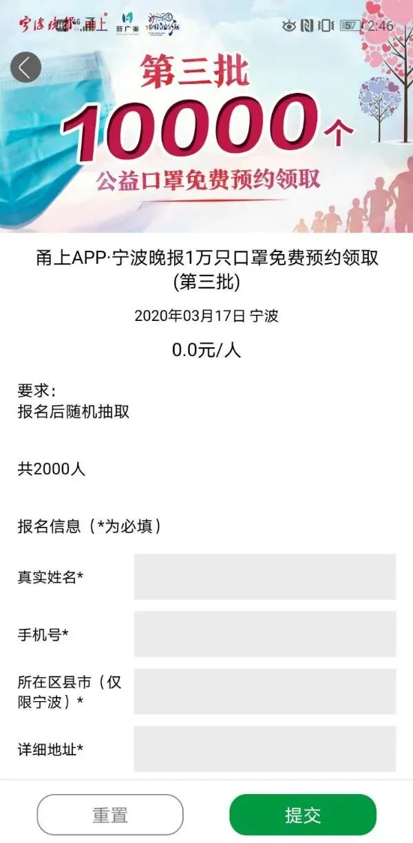 本次活动共发放公益一次性口罩(普通医用标准)1万只,预约不分先后。一个手机号限预约1份(5只一次性口罩)。