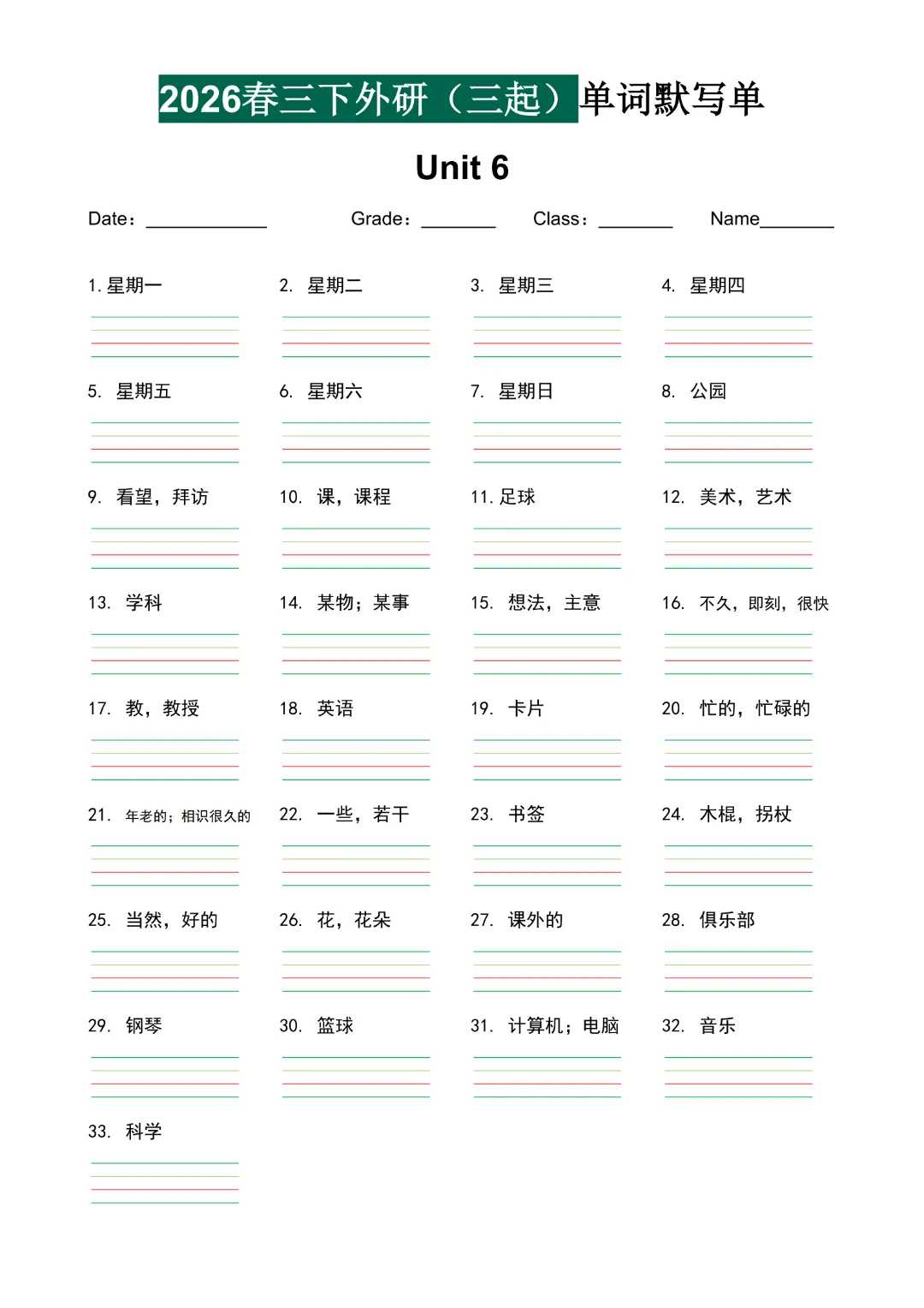 【2026春三下英语】单词默写单(外研版三起点)完整高清电子版可打印