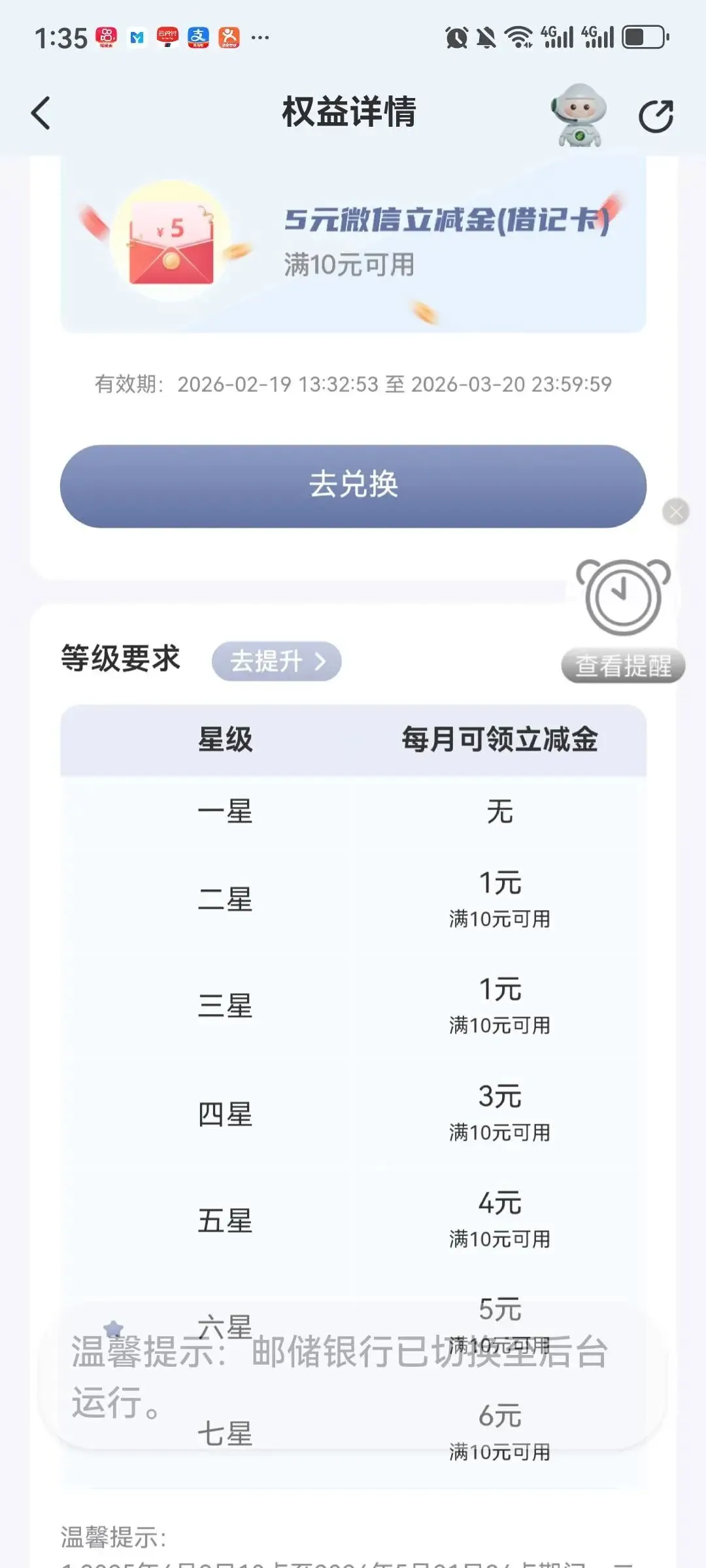 以前非常抢手的星级礼,今天这个时候居然还有(可能是大家都去忙着走亲访友去了),快快快进入邮储银行APP首页里面的权益专区,进去可以看到星级礼遇,点进去以