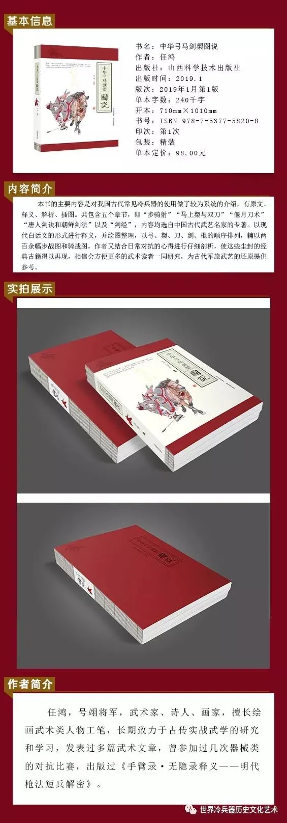 本书按弓箭、马槊、大刀、双手剑、钯棍的顺序排列章次,并配有241幅步战和骑战图,对中国古代常见冷兵器的单兵对战技法有了一个较为深邃的展现,希望可以抛砖引玉。书中有小部分内容涉及步战枪法,都在相应篇幅中做了标注说明,如果能结合《释义》来理解,则对马槊、偃月刀以及棍棒的使用有所禆益。