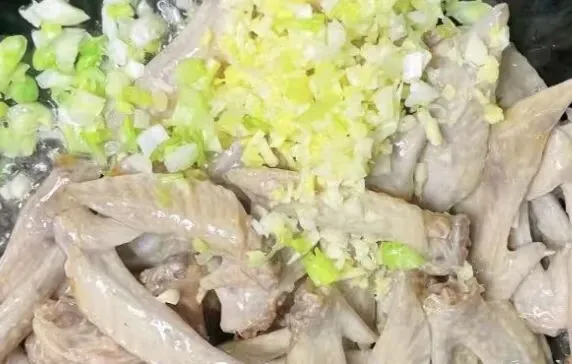 接着加入葱白和蒜末,翻炒出香味,让鸡尖充分吸收葱姜蒜的香气。