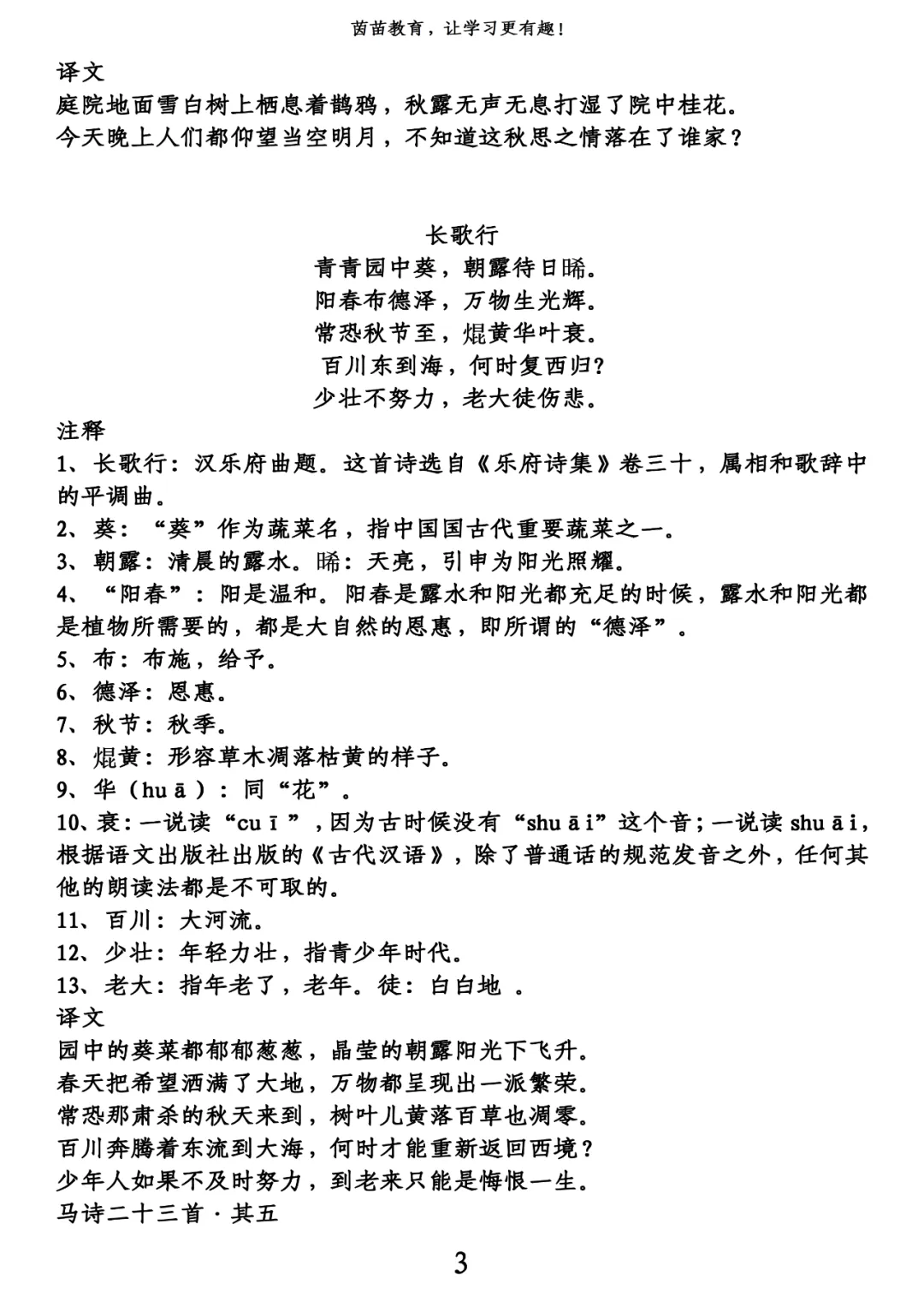 1、长歌行:汉乐府曲题。这首诗选自《乐府诗集》卷三十,属相和歌辞中的平调曲。