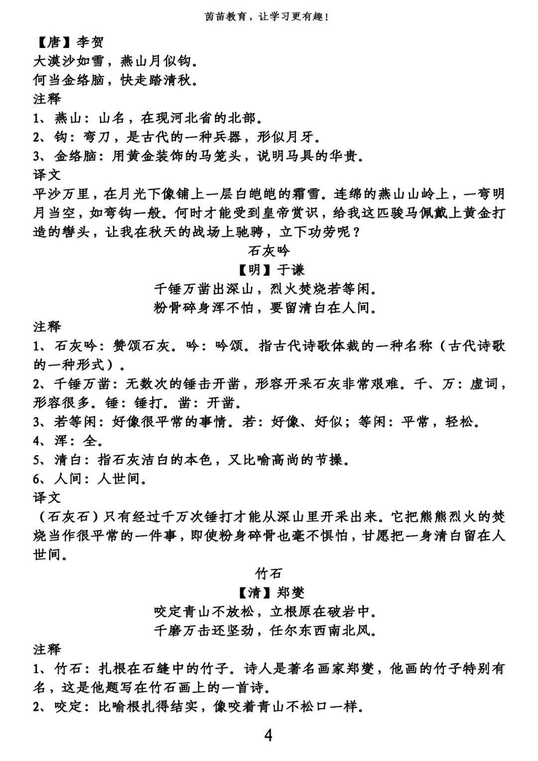 1、石灰吟:赞颂石灰。吟:吟颂。指古代诗歌体裁的一种名称(古代诗歌的一种形式)。