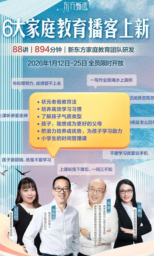 事实上,早在今年1月12日至25日,新东方家庭教育团队研发的系列播客就已登陆平台,88讲内容、总时长894分钟,针对那些让家长头疼的日常难题:孩子看似努力成绩却上不去、一写作业就找借口、听课走神、沉迷手机……内容直指痛点,上线即引发不少家长关注。