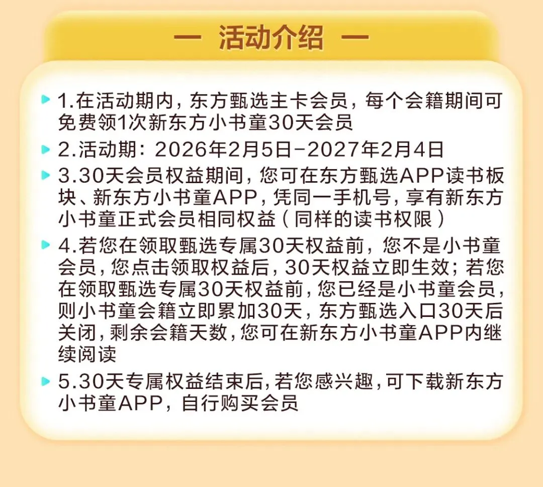 东方甄选主卡会员在活动期内,每个会籍可免费领取一次30天的小书童会员体验(价值60元)。