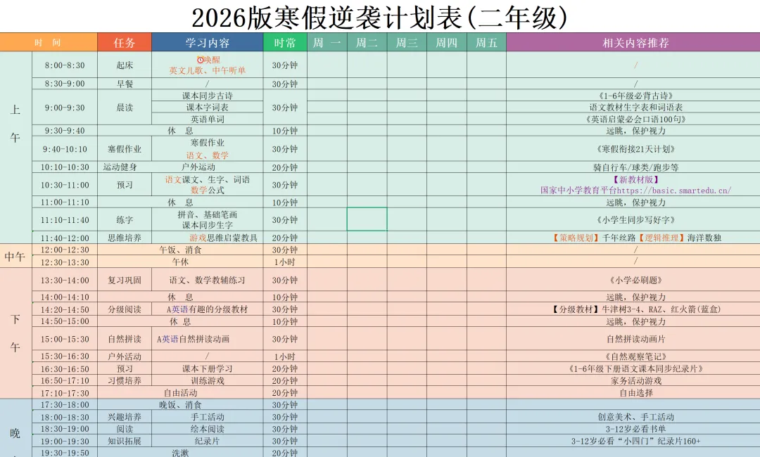 2026版《寒假逆袭计划表+读书记录卡》电子版可下载可打印,推荐收藏