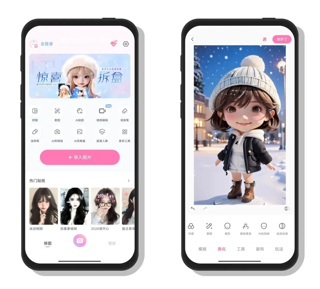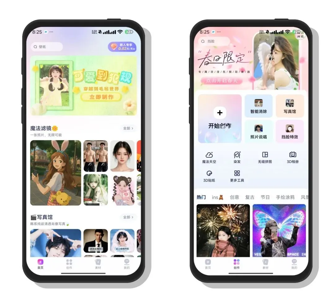 这是一款主打AI创意修图与特效创作的手机App,它以“春日限定”等氛围感主题为特色,提供了丰富的创作工具:既有智能消除、挡脸特效、魔法天空、染发等实用修图功能,也有照片说唱、写真馆、3D相册、3D贴纸等趣味玩法,还覆盖了无缝拼图等基础编辑需求,同时内置热门、ins、复古等多种风格滤镜模板,能让用户轻松打造出氛围感十足的照片与创意作品,适合喜欢分享生活、追求个性视觉效果的用户。 •͈ ₃ •͈
