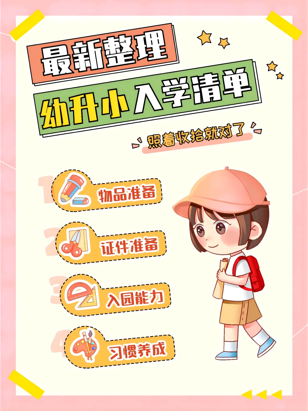告别幼儿园,即将踏入小学课堂,家长们是不是既期待又有点手忙脚乱?别慌!这份超全幼升小入学清单已整理好,从物品准备、证件准备、能力培养到习惯养成,四大板块全覆盖,帮孩子轻松衔接小学生活。快收藏起来,照着准备不踩坑,让宝贝自信迎接新起点吧~
