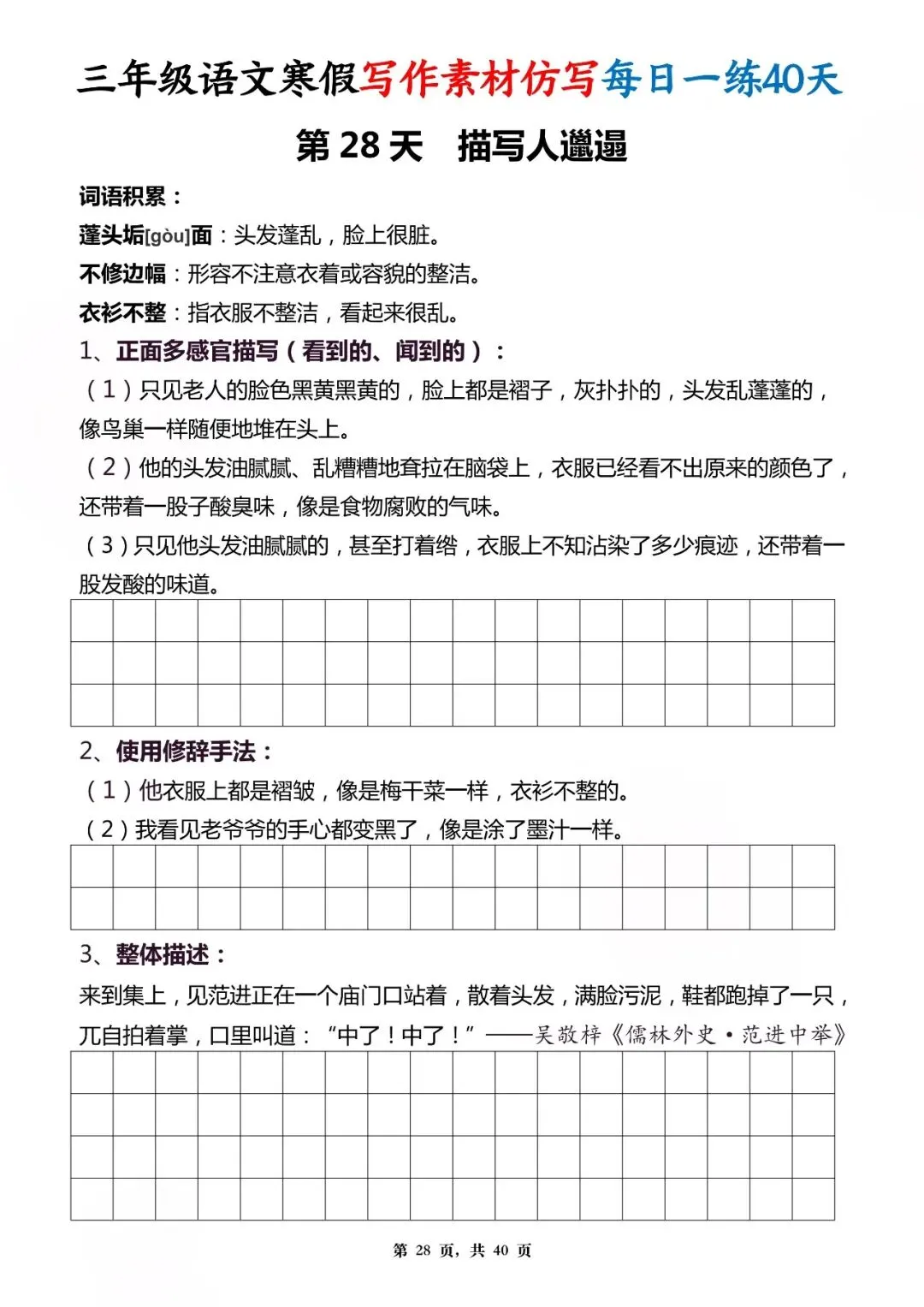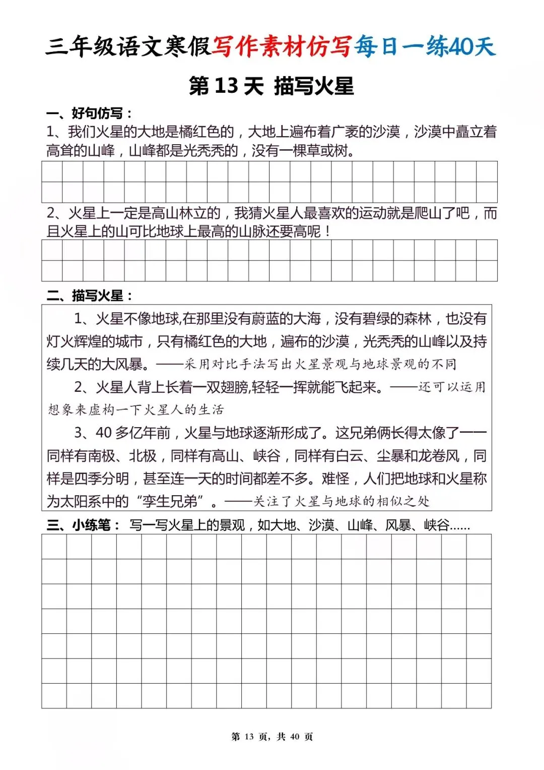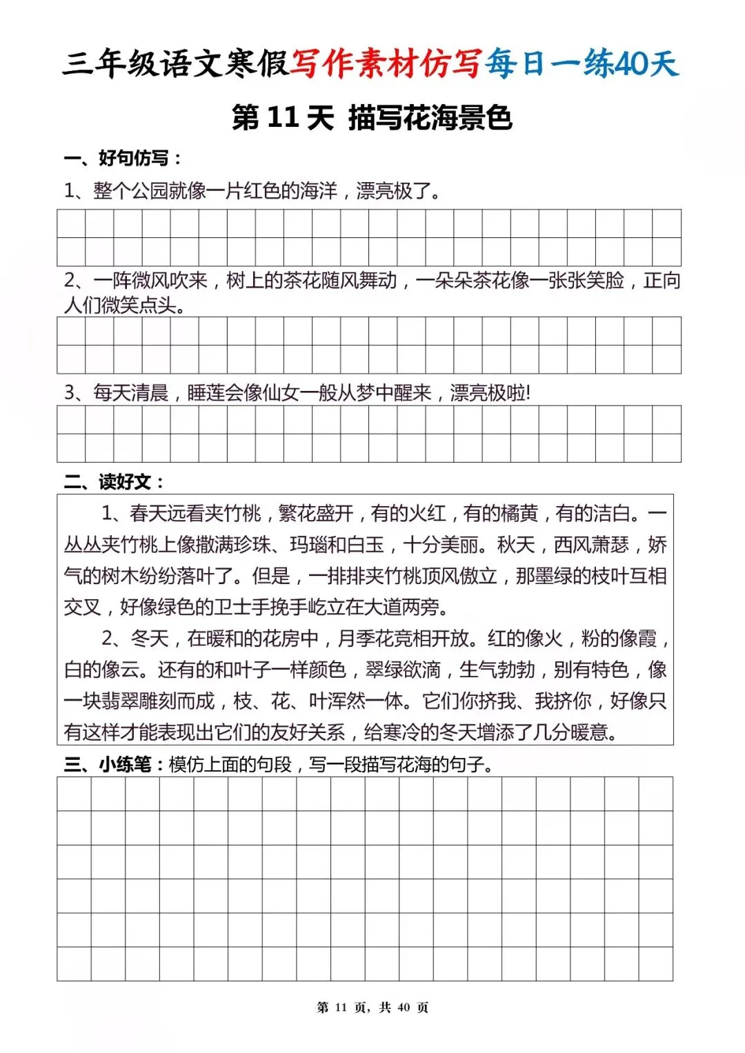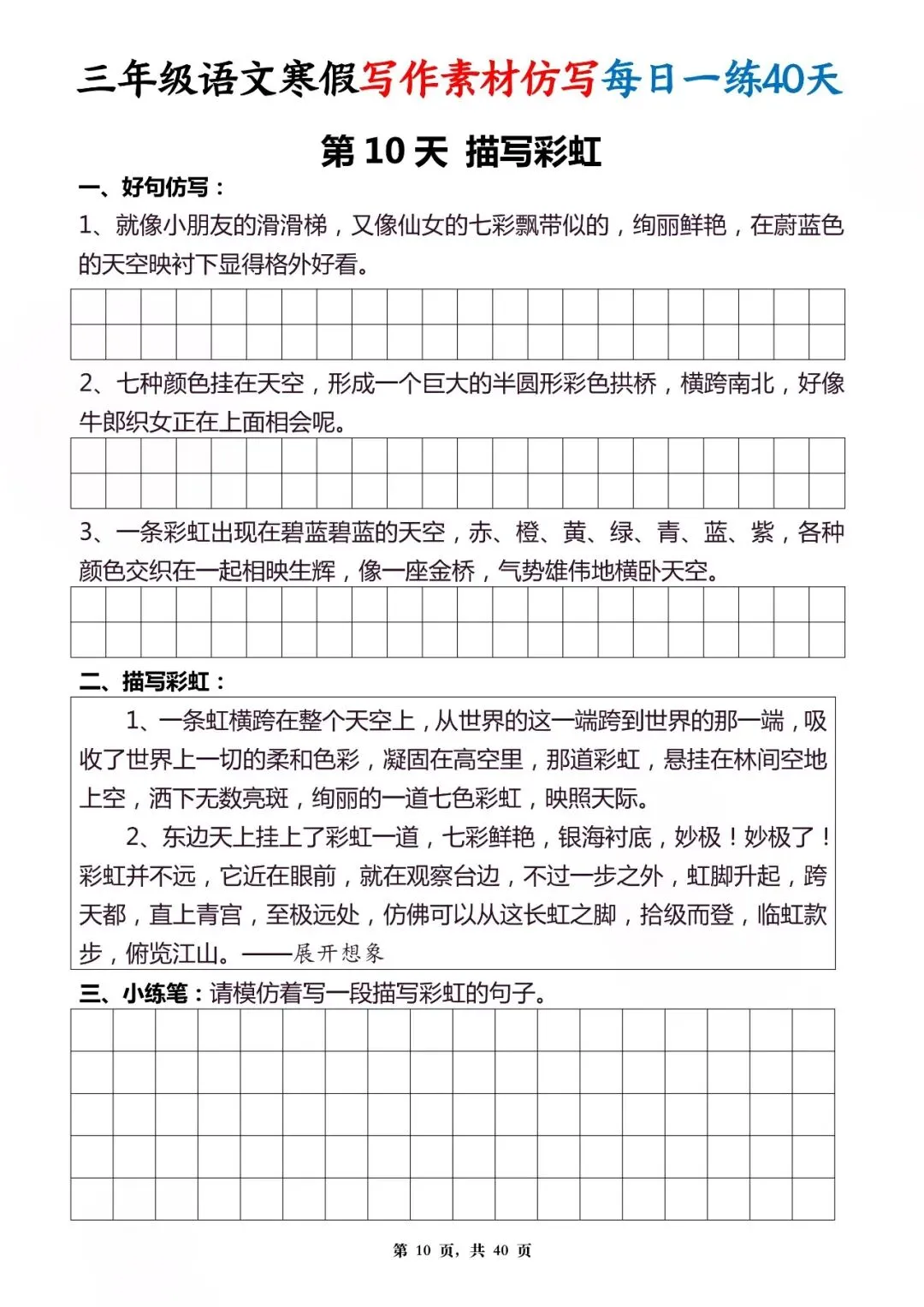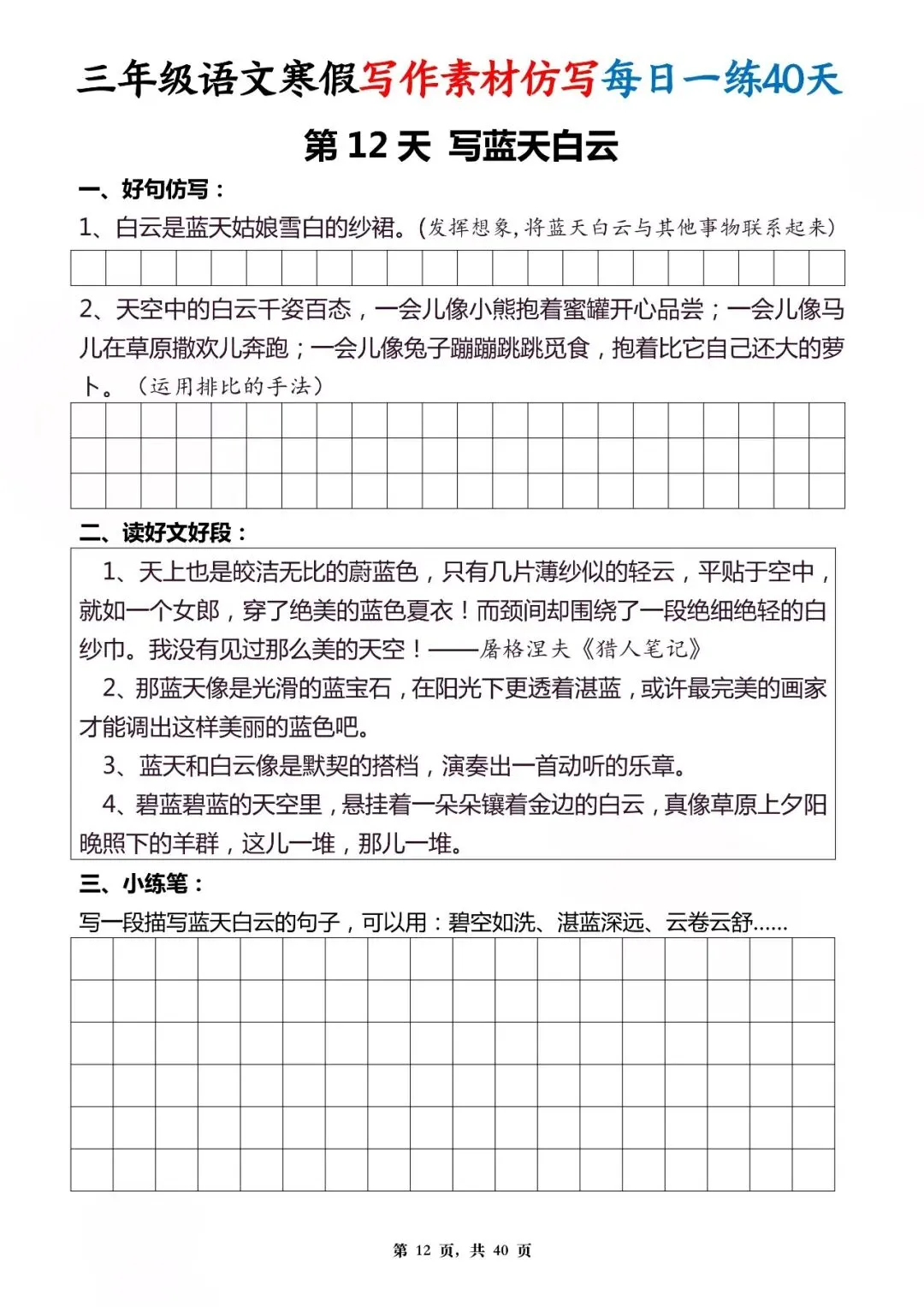 三年级下册语文寒假写作素材仿写每日一练,电子版可打印可下载