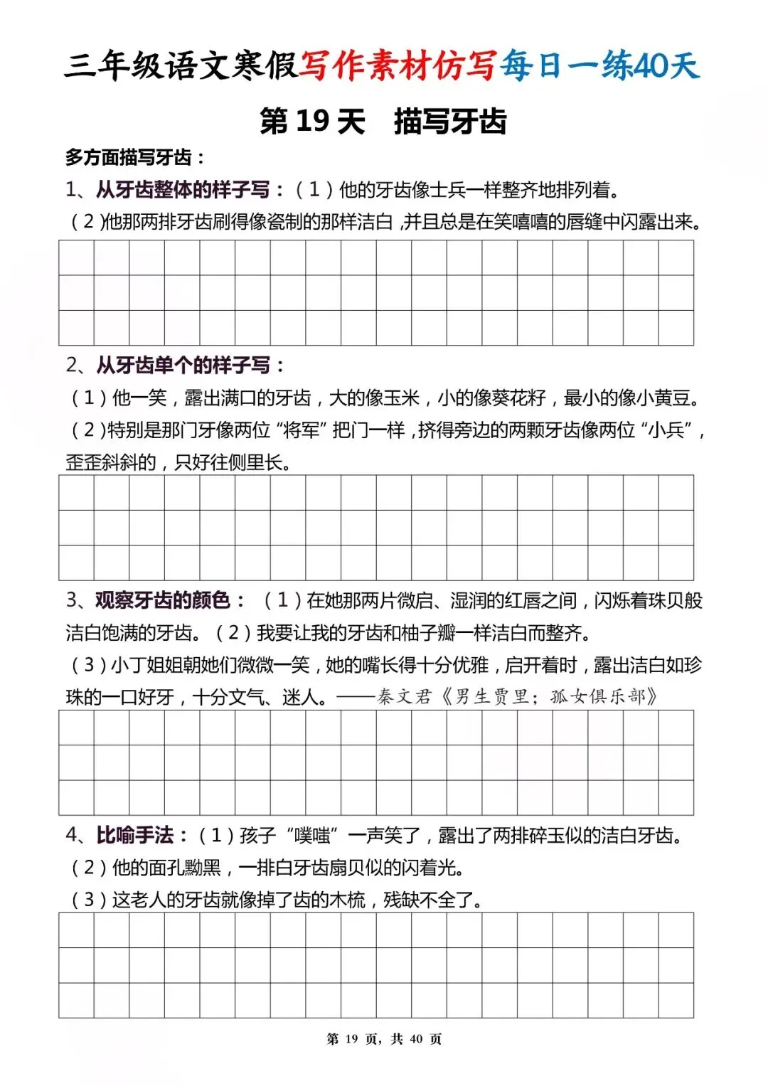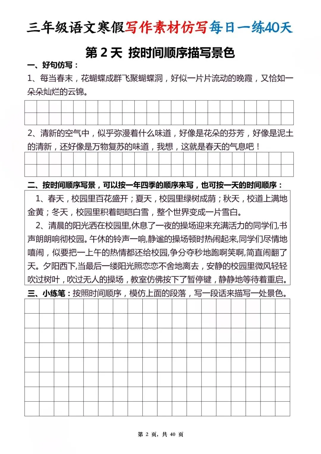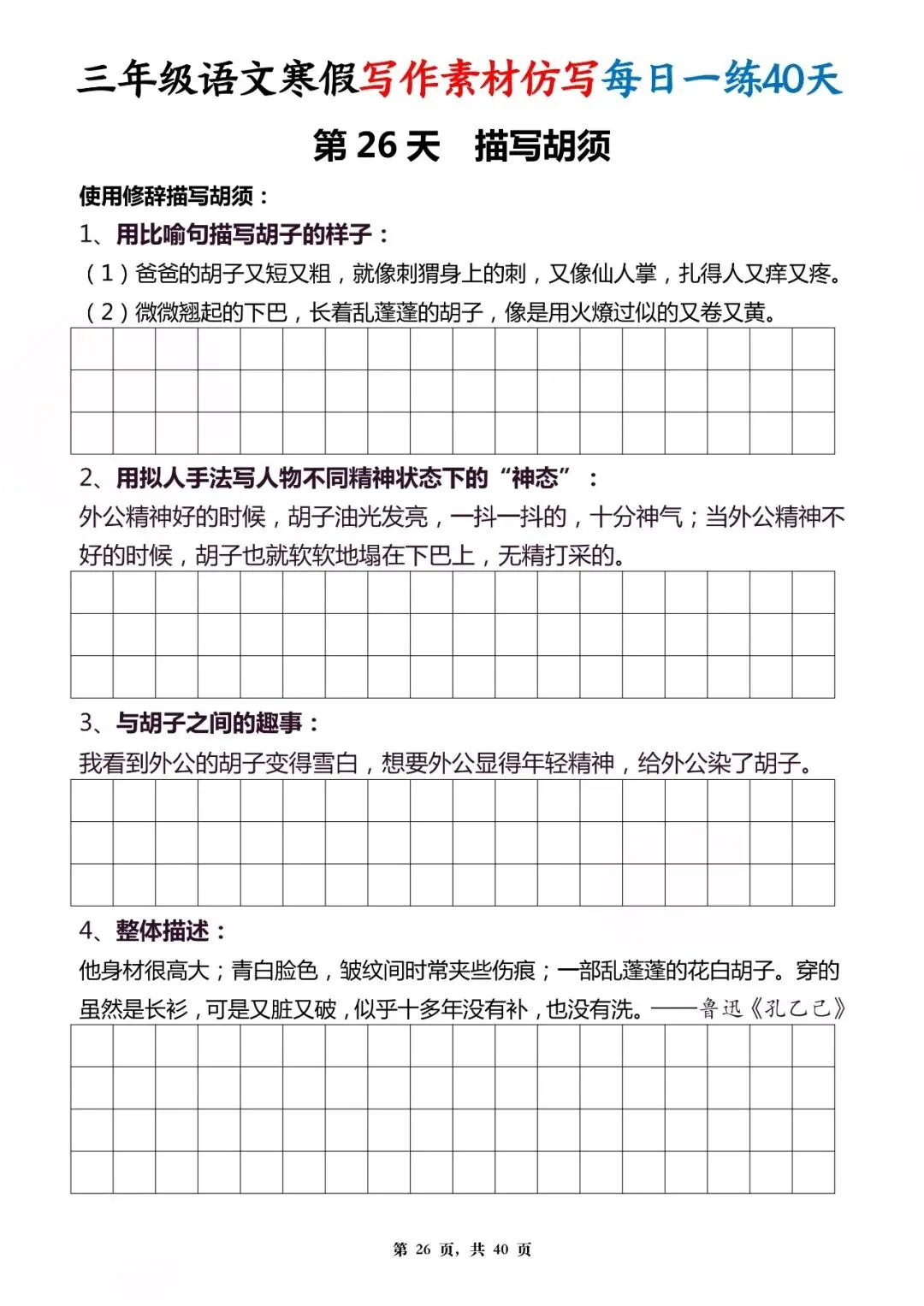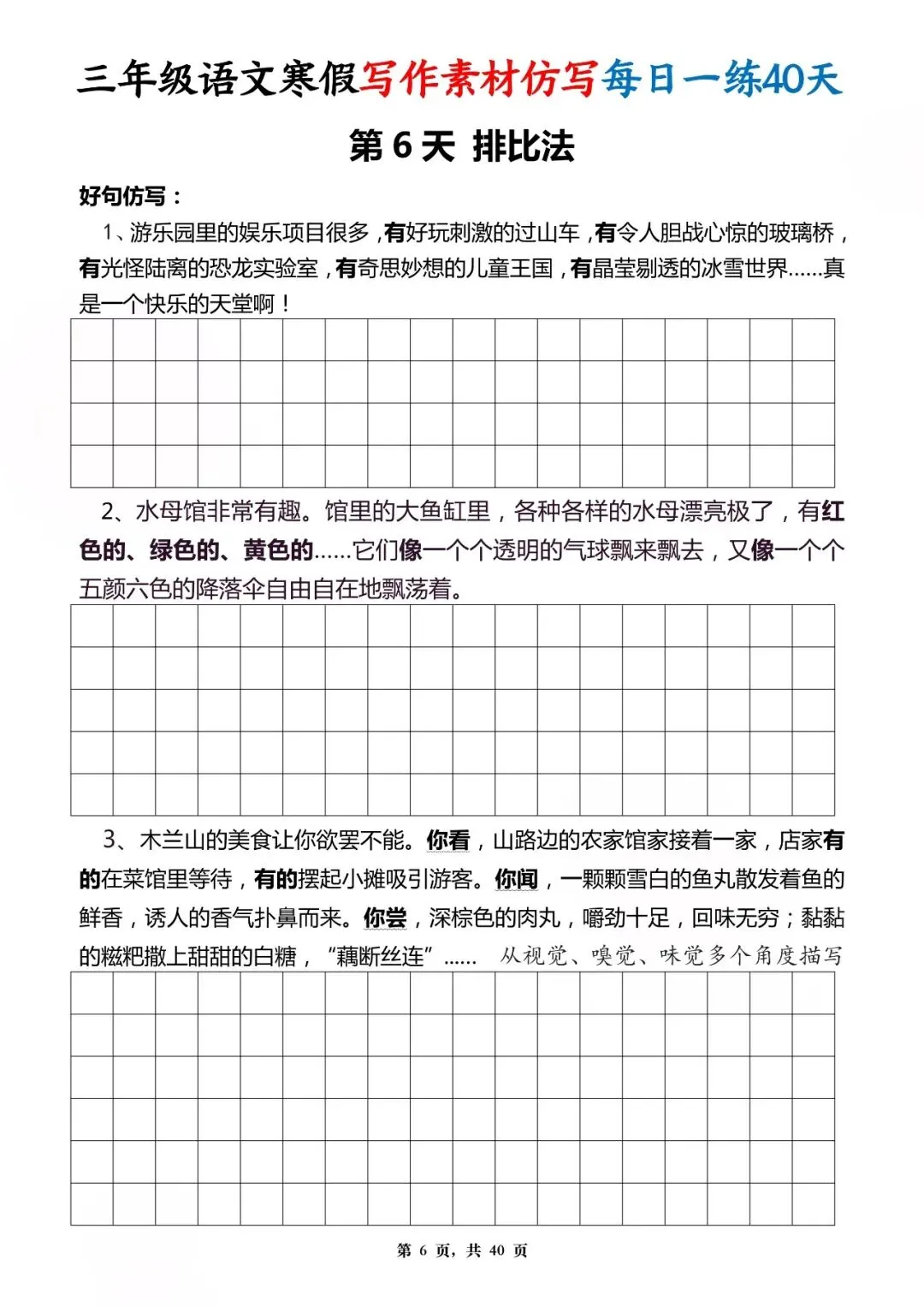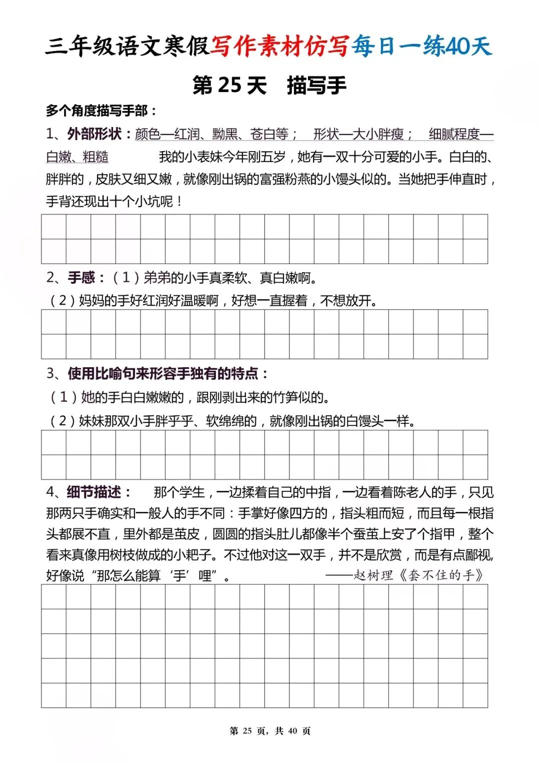 三年级下册语文寒假写作素材仿写每日一练,电子版可打印可下载
