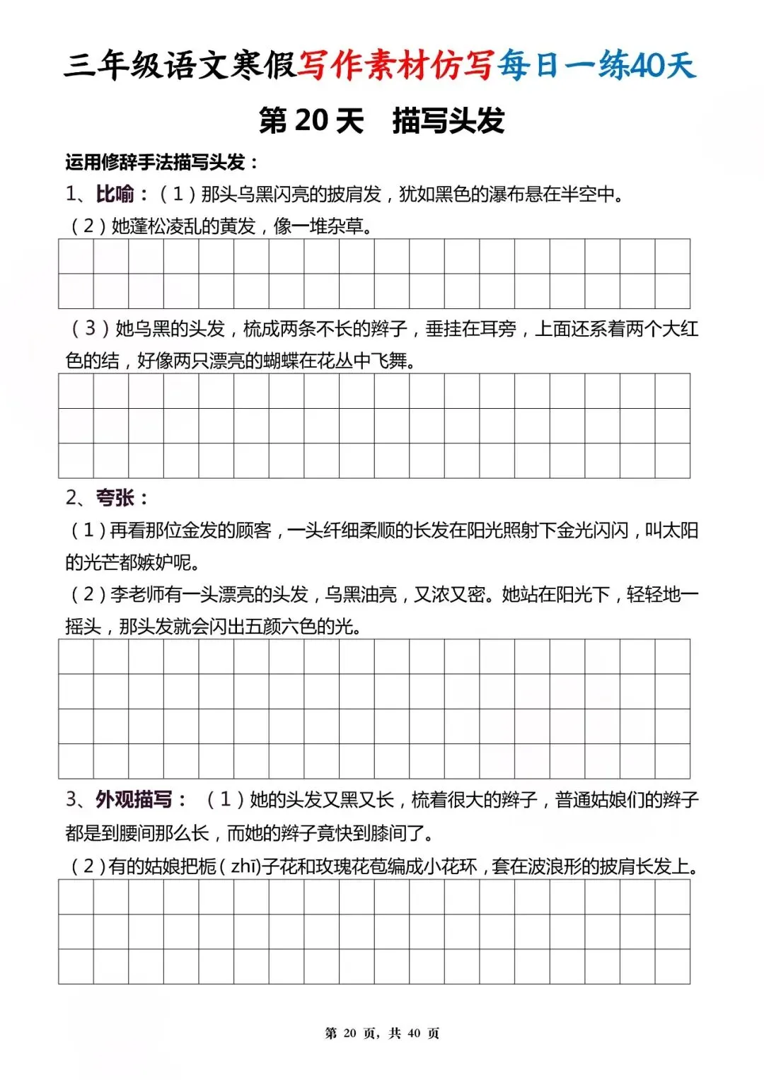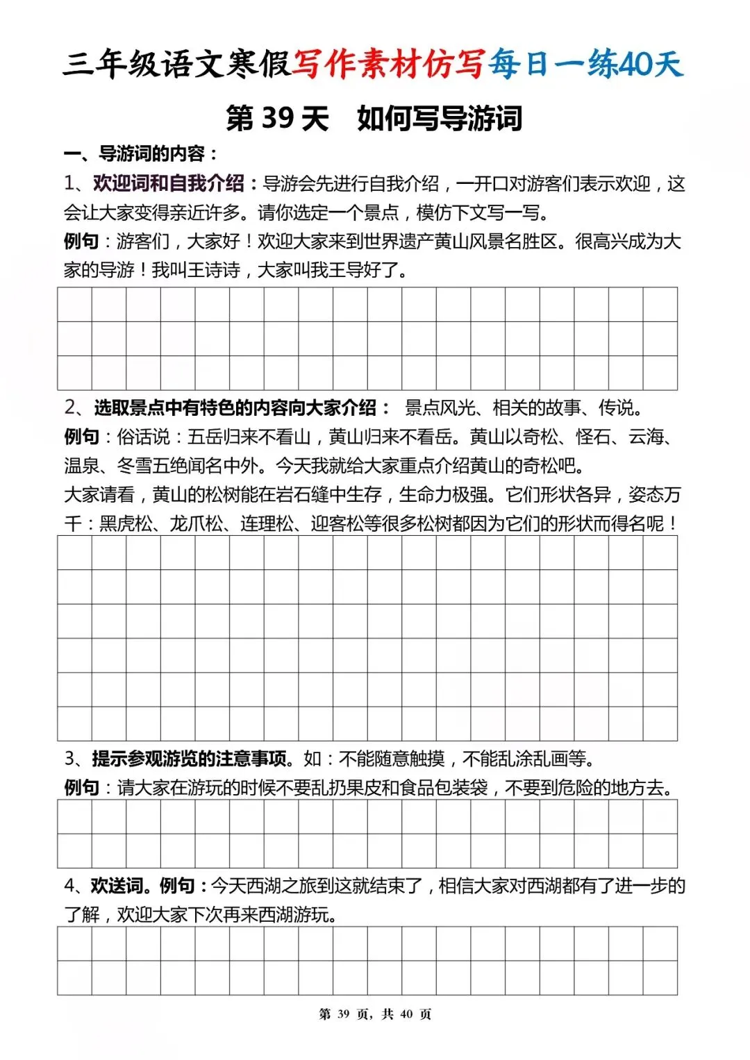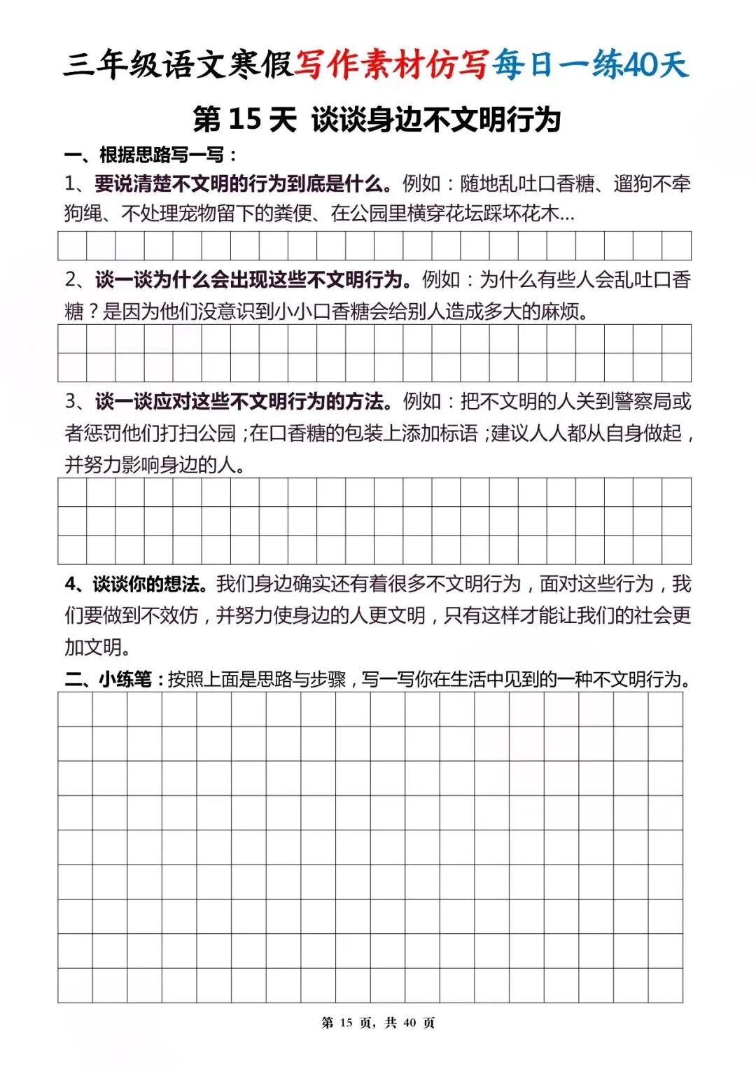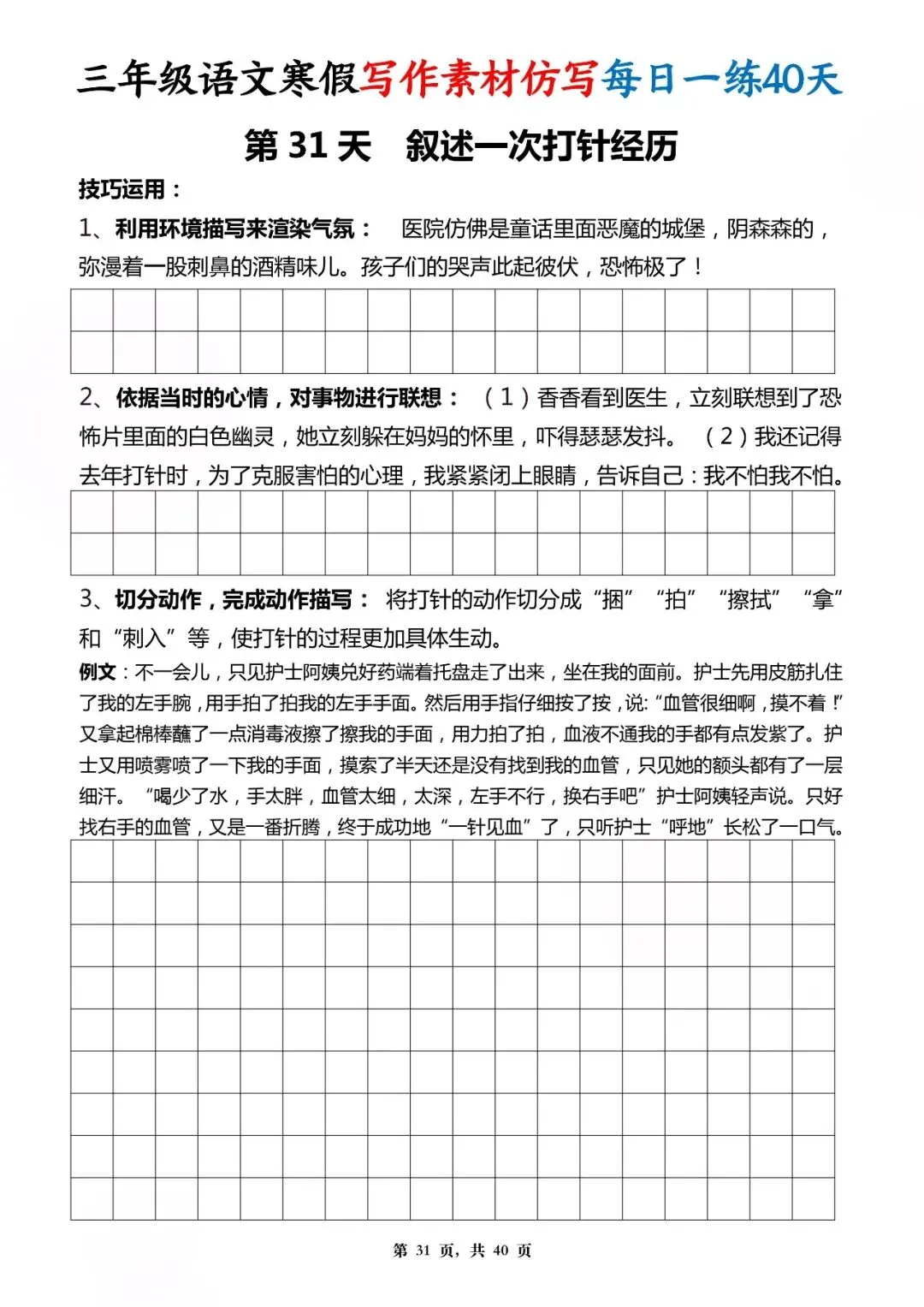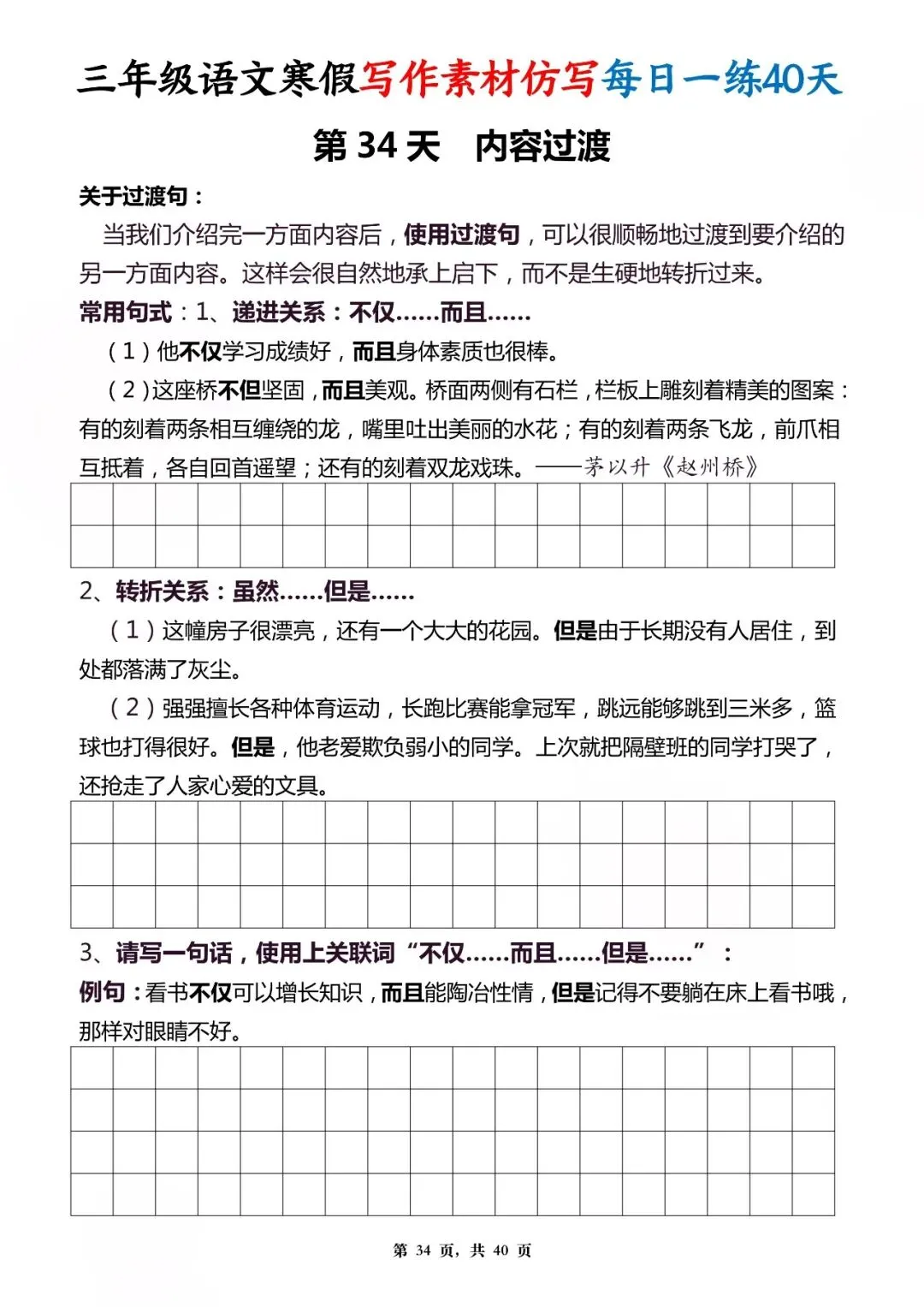 三年级下册语文寒假写作素材仿写每日一练,电子版可打印可下载