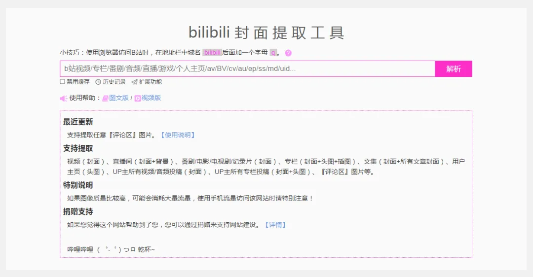 5. Bilibili封面提取这是一个简单而强大的B站封面提取工具,可以帮助用户提取视频、专栏、直播等封面图片。支持从视频平台抓取各种内容的封面,包括视频、专栏、UP主个人主页、评论区图片等。特别适合需要封面素材的用户。