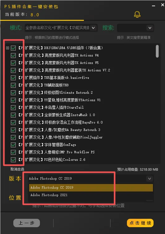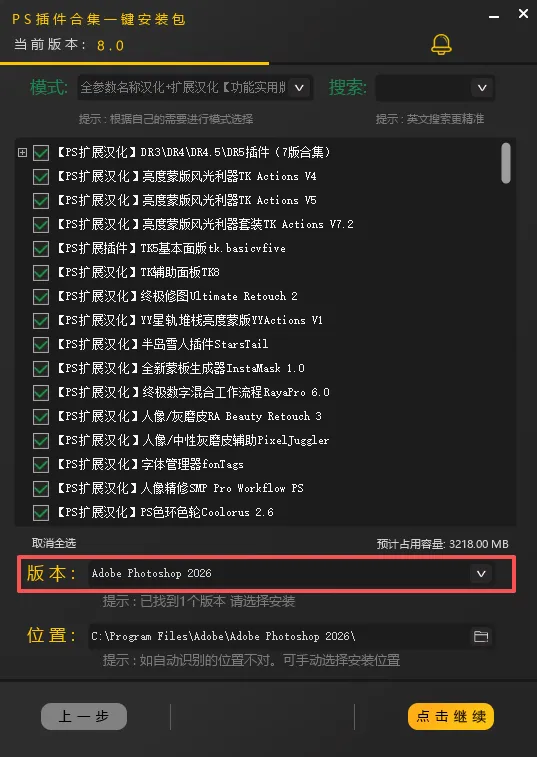 安装便捷:摒弃手动复制粘贴的复杂操作,数分钟内自动识别 PS 路径,可一键全装或按需选择。