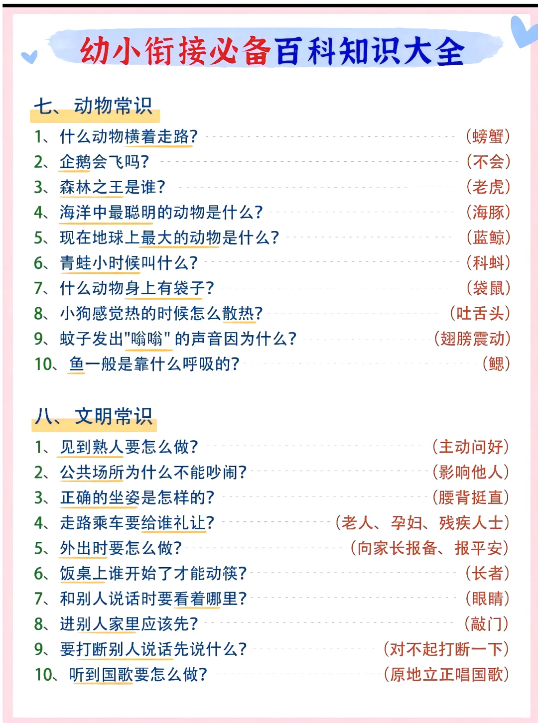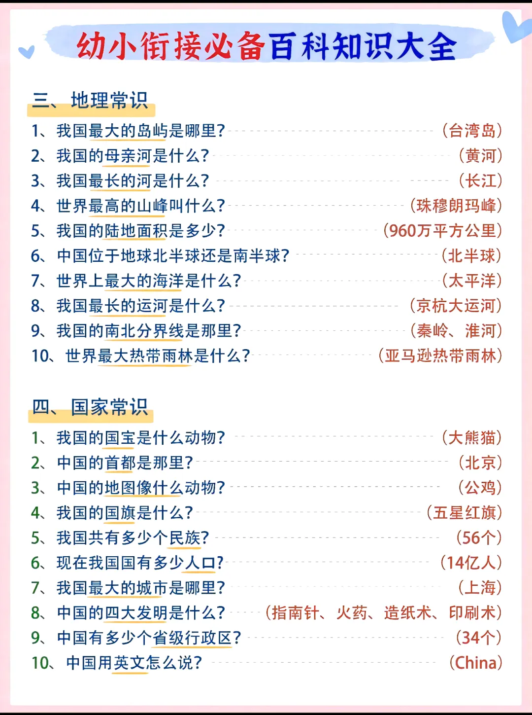 幼升小衔接,知识储备不能少!这份百科知识大全涵盖文化常识+节日常识等等,从十二生肖、四大名著到节日习俗,考点清晰好记,帮孩子轻松应对入学测试。每天5分钟,积累知识、拓宽视野,让孩子赢在起跑线~家长快收藏,陪娃一起学!