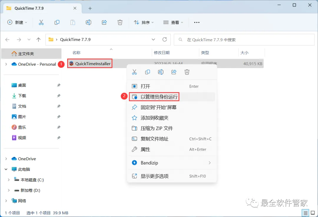 3、找到【QuickTimeInstaller】应用程序,右键选择【以管理员身份运行】它