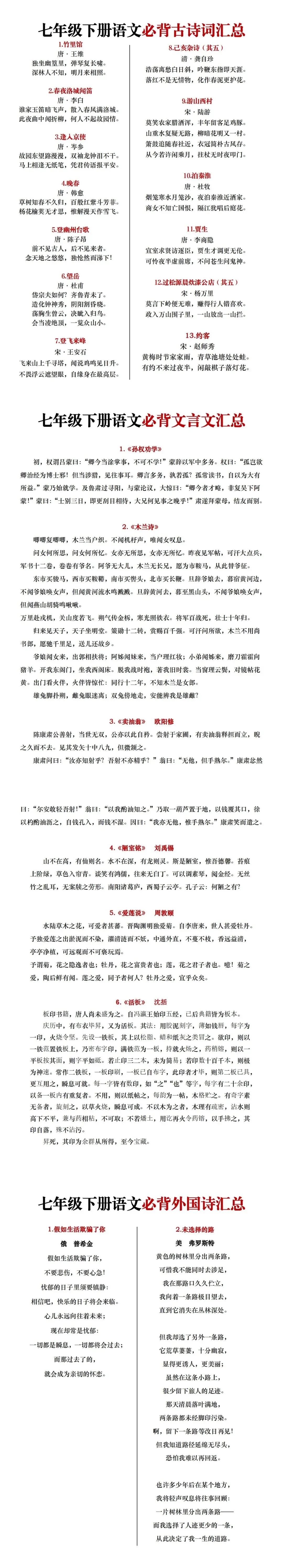 2026版七年级下册语文预习必背古诗词汇总,可打印电子版!
