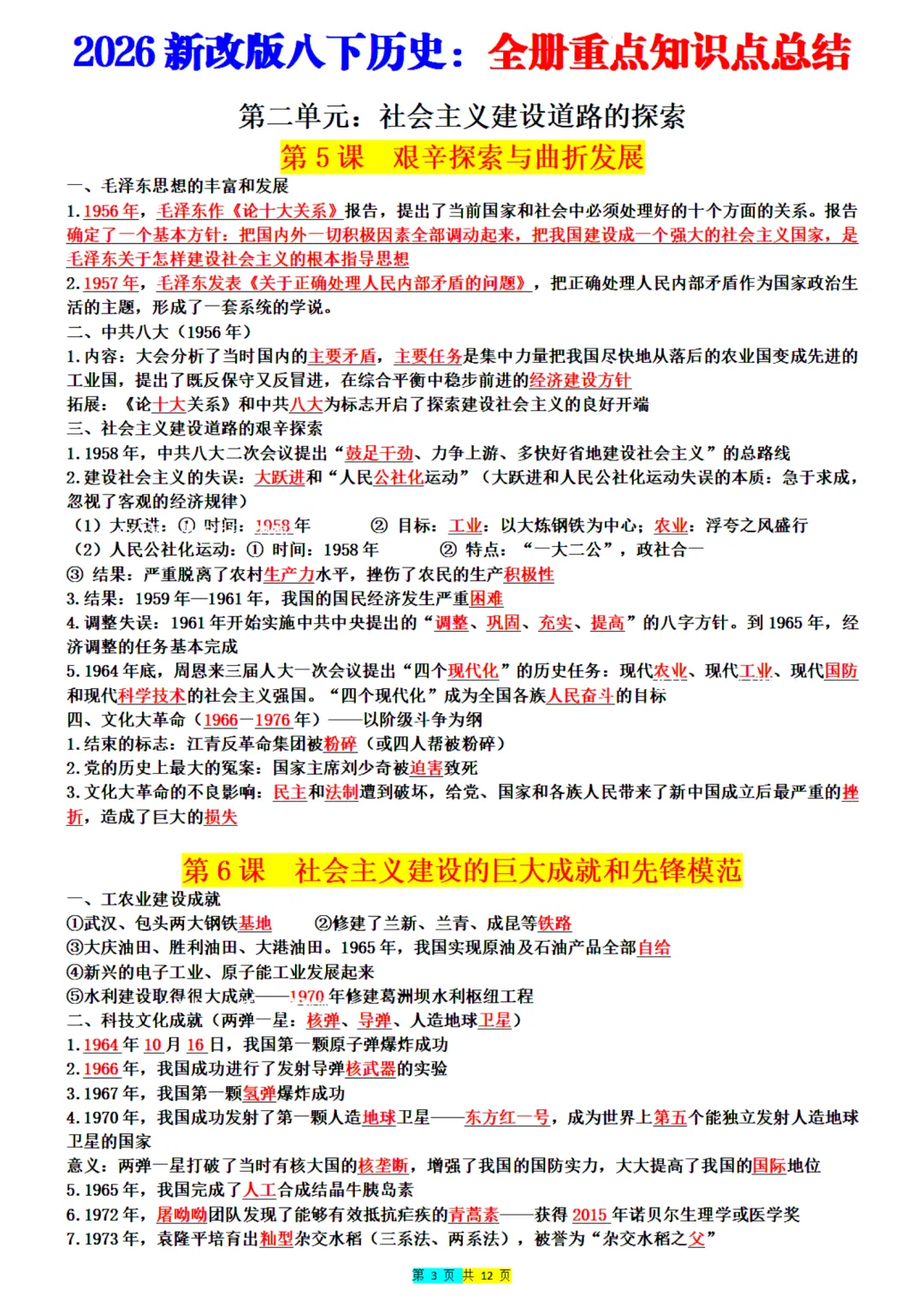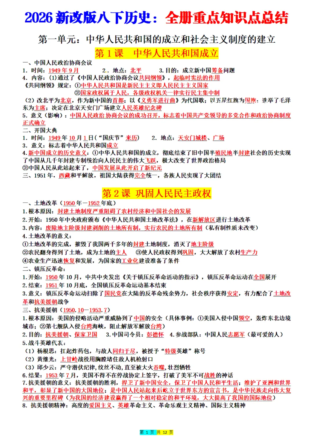 2026年最新版八年级下册历史全册重点知识点总结,老师整理了完整,可打印,建议家长打印,学霸人手一份!